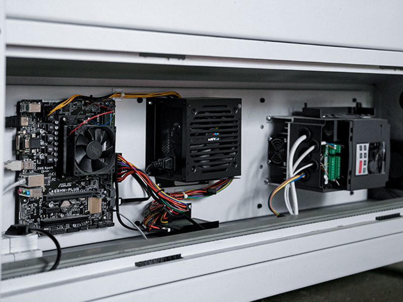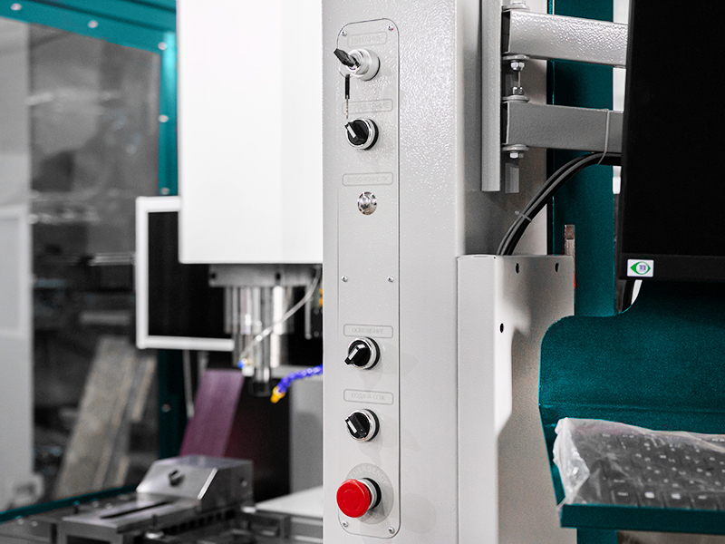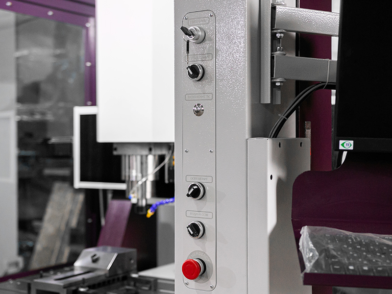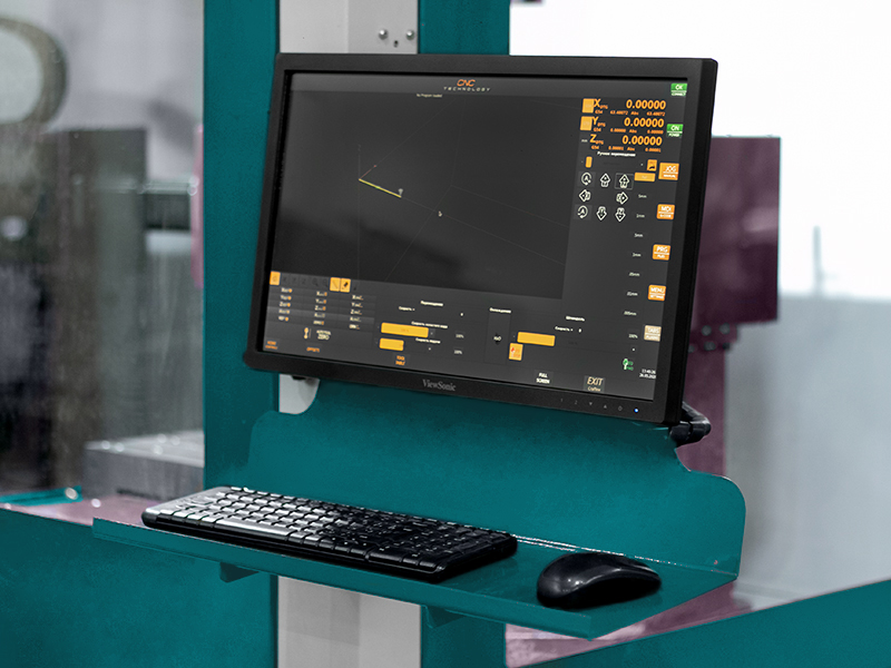 В базовой комплектации устанавливается система Linux CNC, но по желанию возможна установка DSP-пульта. Блок управления и ПК размещены в задней части станины, а монитор с клавиатурой и мышью находятся на подвижном кронштейне — для удобства оператора.