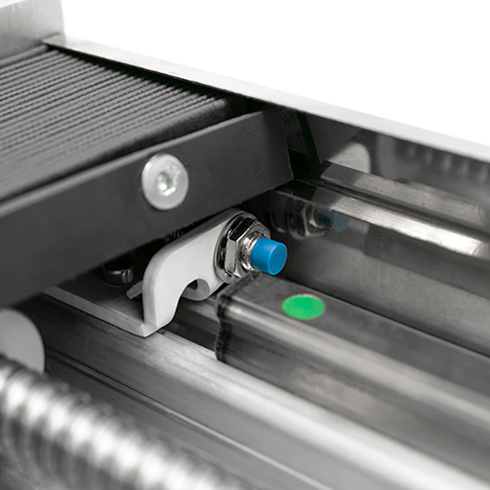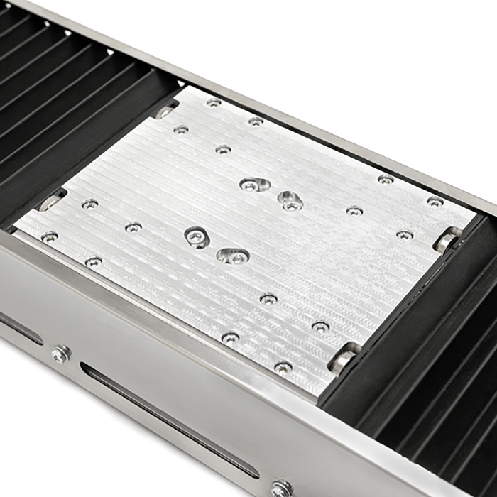 - Гофрозащита предохраняет от попадания пыли и продуктов обработки на ШВП и линейные подшипники, продлевая срок службы модуля.