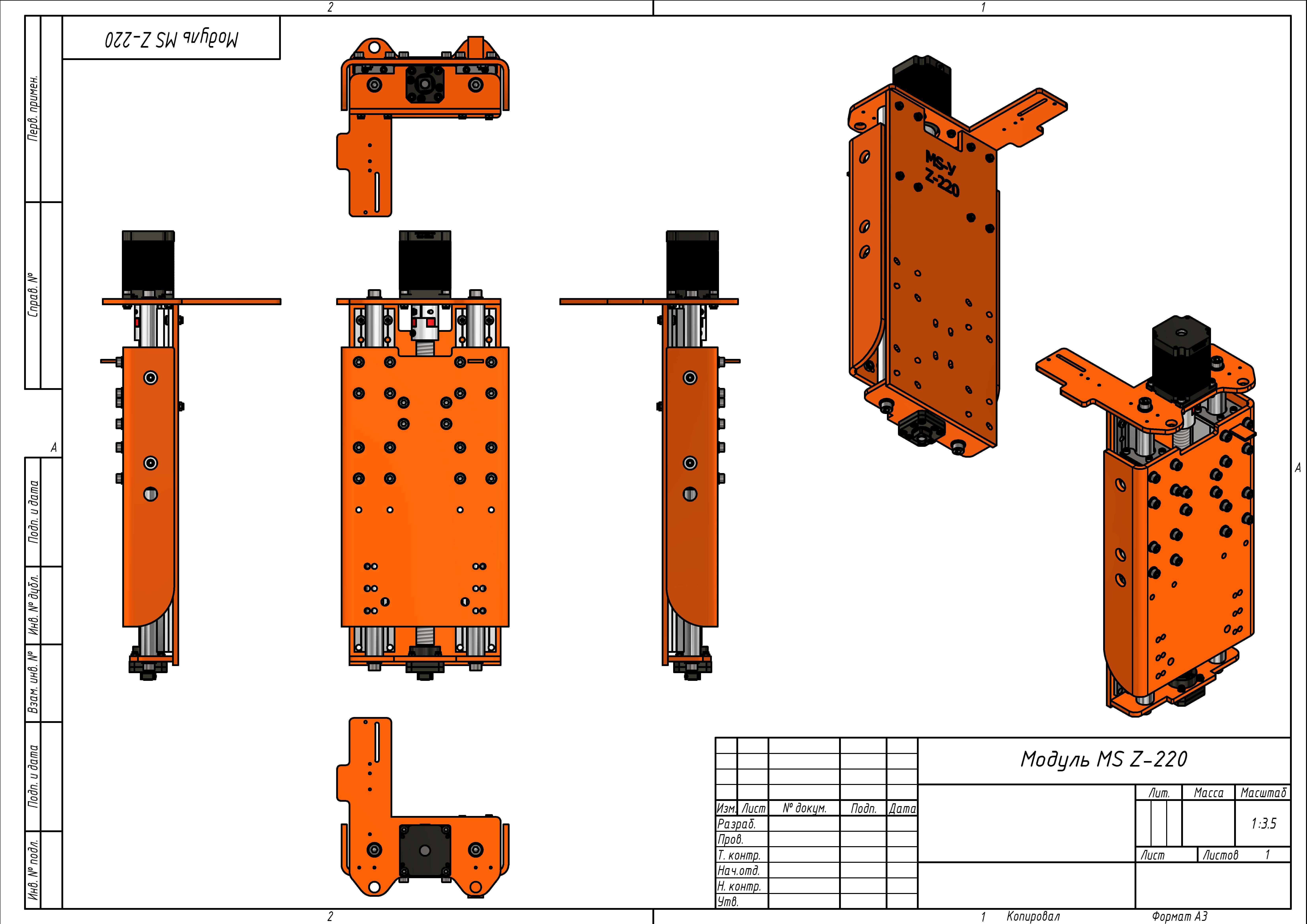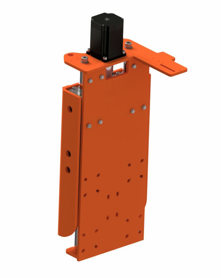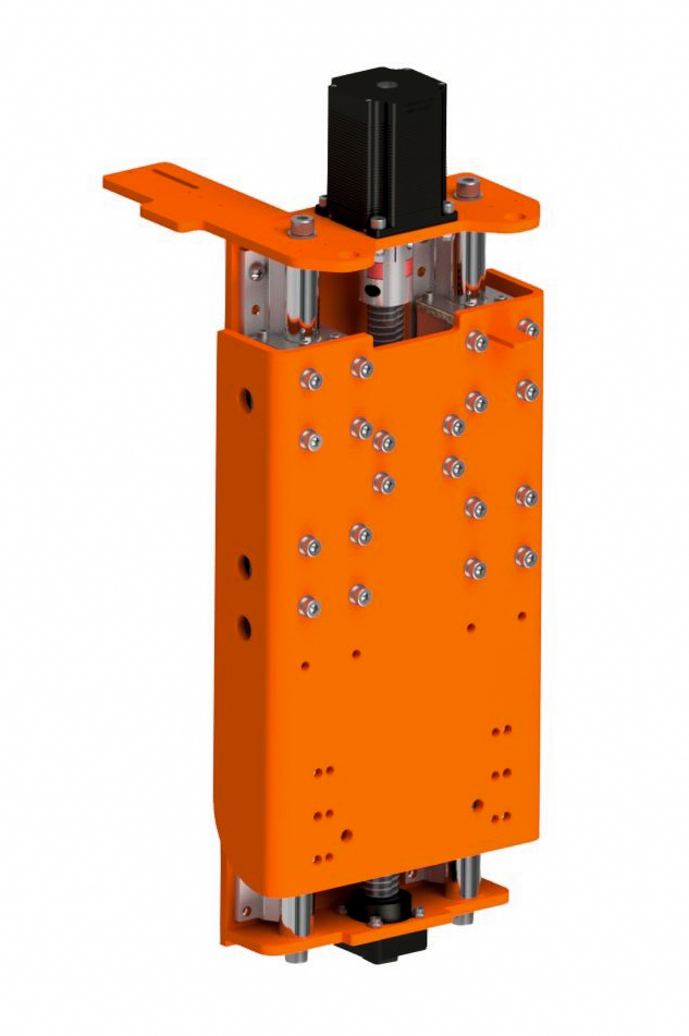 Механический привод модуля выполнен на основе цилиндрических рельс и линейных подшипников, направляющих движение передней пластины. Перемещение пластины осуществляется с помощью шагового двигателя серии NEMA 23, приводящего в движение пластину посредством шарико-винтовой пары.
