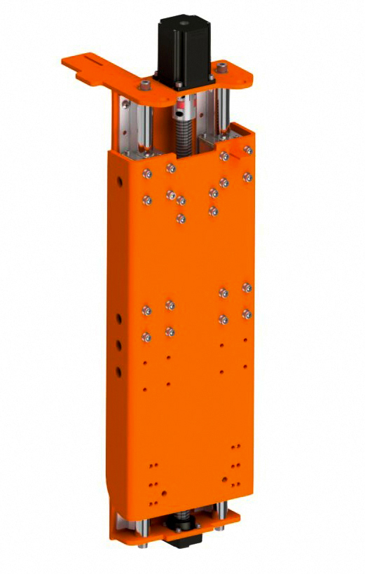 Механический привод модуля выполнен на основе цилиндрических рельс и линейных подшипников, направляющих движение передней пластины. Перемещение пластины осуществляется с помощью шагового двигателя серии NEMA 23, приводящего в движение пластину посредством шарико-винтовой пары.