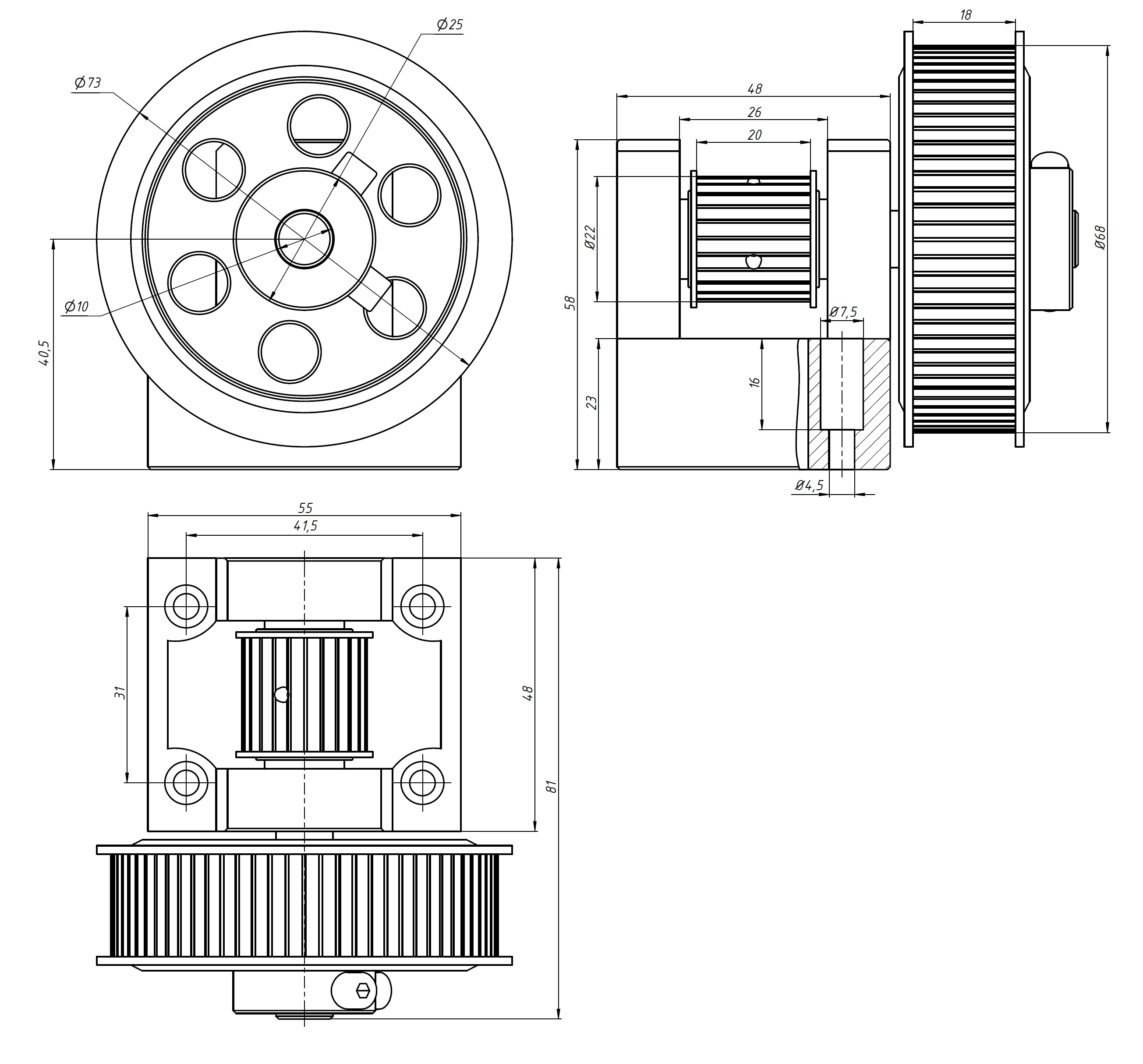 Модуль для ременной передачи по оси X лазерного станка. Включает в себя крепление и два шкива с редукцией 3:1 для зубчатого ремня 3M-15.