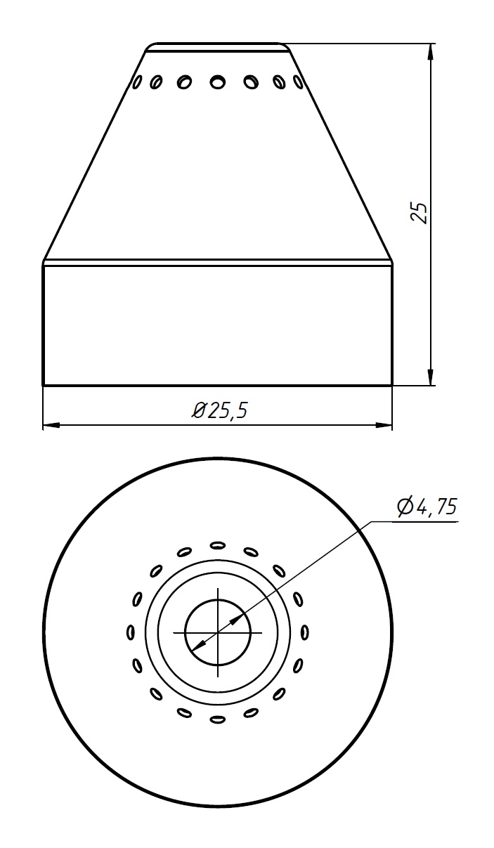 Экран предназначен для защиты сопла: от непредвиденного контакты с обрабатываемым материалом; от попадания продуктов горения при обработки; от двойной дуги во время поджига. Также для корректировки напрявления подаваемого воздуха и плазменной дуги.