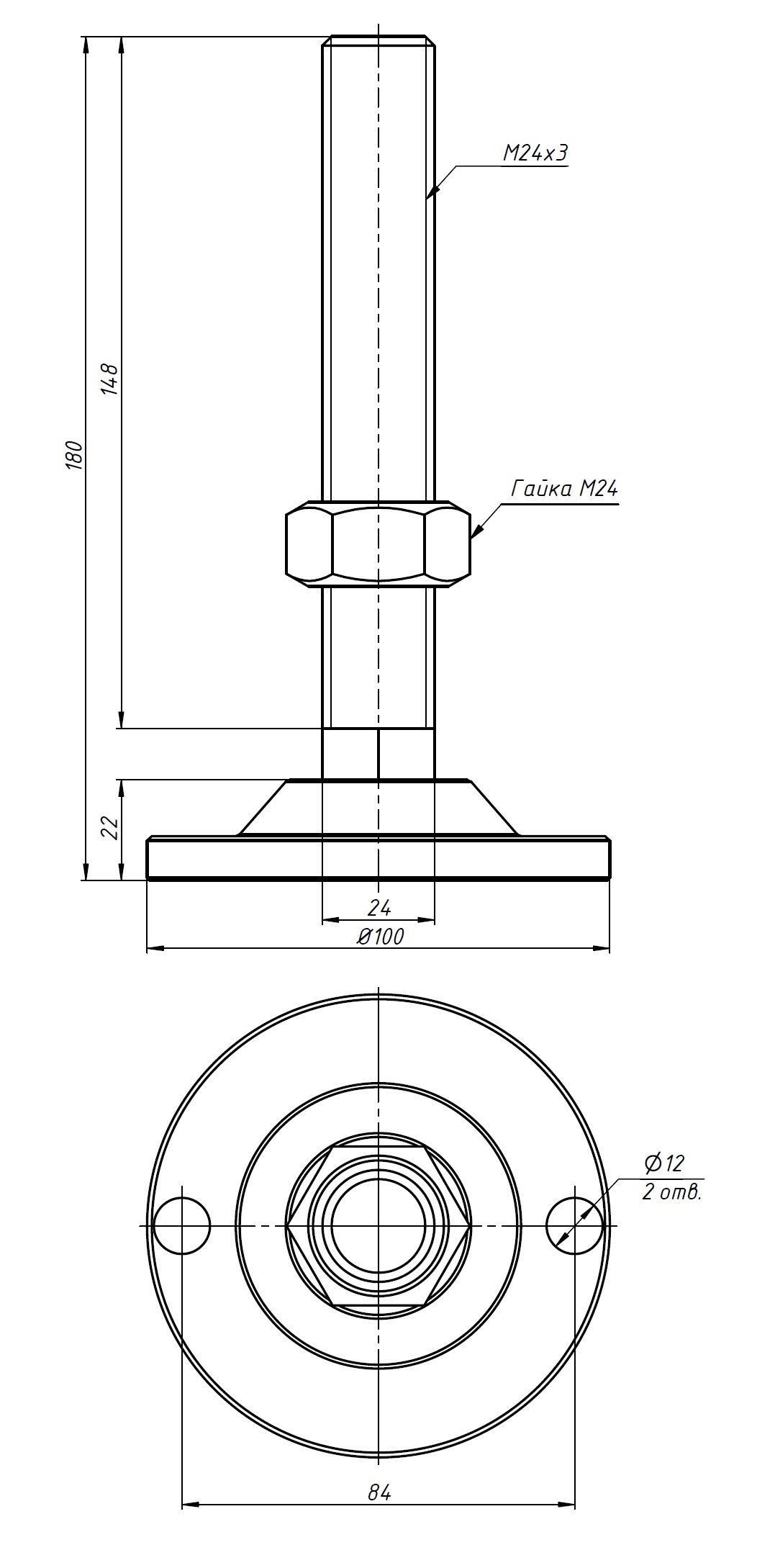 Опора резьбовая с металлическим оцинкованным резьбовым стержнем М24х150 и круглым стальным основанием диаметром 100 мм. Используется в основном для регулировки конструкции по высоте.