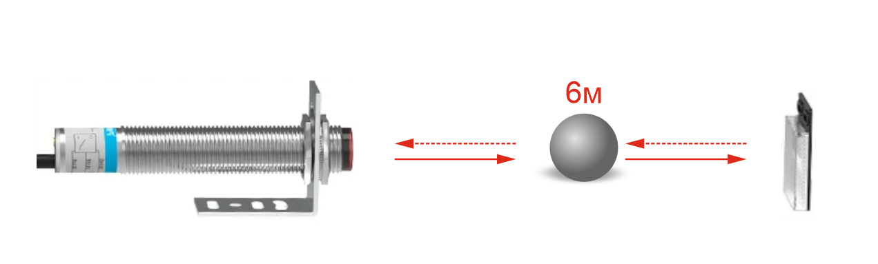 Принцип действия рефлекторного датчика идентичен с диффузионным датчиком и основан на принципе частичного отражения световой волны от поверхности материала. Отличие заключается в том, что в качестве отражающей поверхности выступает рефлектор, являющийся по сути зеркалом, отражающим свет под широком углом падения, что избавляет пользователя от необходимости точной установки отражателя.