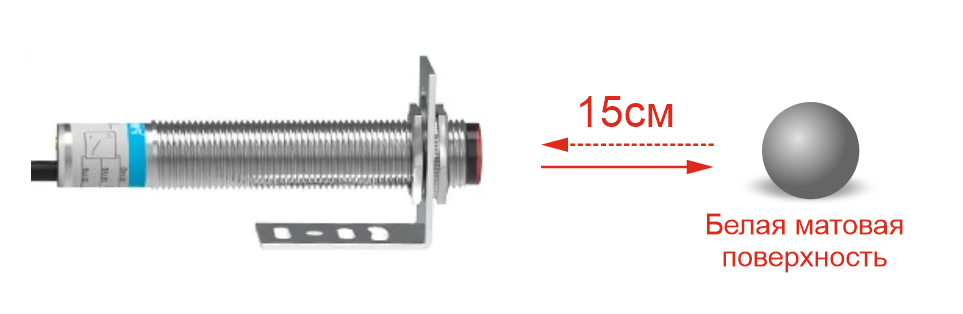 Диффузионный фотодатчик основан на принципе частичного отражения световой волны от поверхности материала. Стандартная дистанция в 150 мм указана для белого матового листа бумаги (также подлежит регулировке), однако на других поверхностях расстояние срабатывания датчика будет сильно отличаться. Так, к примеру для черного матового цвета данный датчик будет срабатывать на расстоянии менее 150 мм, если же это будет зеркало, то это расстояние будет огромным при условии, что зеркало расположено строго под углом в 180 градусов относительно датчика. Учитывайте данные свойства фотодатчиков при выборе.