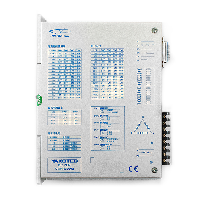 YKD3722M — это высокопроизводительный цифровой драйвер шагового двигателя, основанный на 32-битной технологии цифровой обработки сигналов нового поколения. Напряжение питания составляет 110–220 В переменного тока. Он подходит для различных типов трёхфазных гибридных шаговых двигателей с током менее 7,0 А и внешним диаметром 86–130 мм.