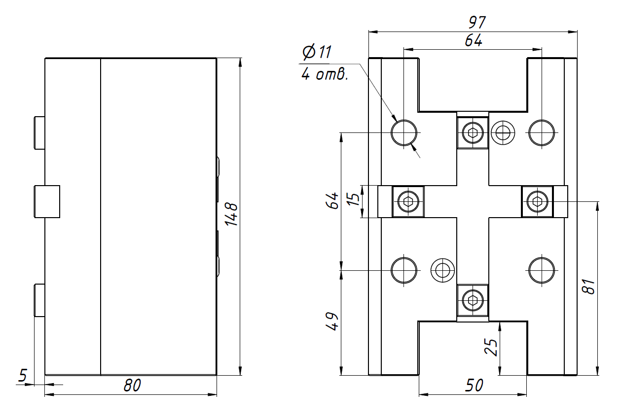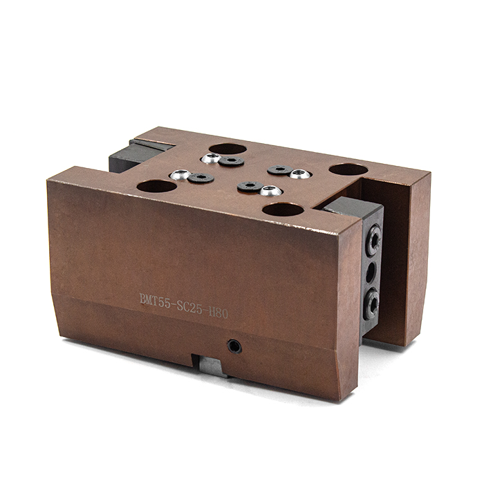 Стационарный держатель инструмента BMT55-SC25x80 представляет собой инструментальный блок, предназначенный для закрепления в нем резцов, державок и другого инструмента с квадратным хвостовиком шириной 25 мм в осевом направлении к заготовке. Длина зажимаемой части хвостовика – 80 мм. Блок фиксируется в револьверной головке BMT станка с помощью четырех винтов.