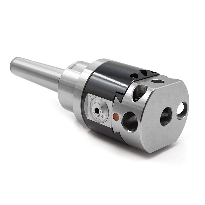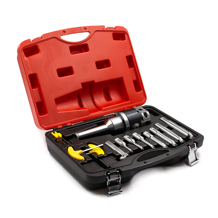 Расточная система предназначена для чистового растачивания отверстий диаметром от 8 до 280 мм, применяется на станках фрезерной, сверлильной и расточной группы (включая оборудование с ЧПУ). Набор состоит из фрезерного патрона с конусом Морзе №4 с резьбой, расточной головки NBH2084, расточных державок SBJ (8 шт) и комплекта ключей. Диаметр хвостовиков державок 20 мм. В зависимости от типа державки используются твердосплавные пластины TBGT или TBGH. Державки SBJ надежно фиксируются в корпусе расточной головки при помощи шестигранного болта. Микрометрическая расточная головка NBH2084 снабжена регулировочным винтом со шкалой и позволяет перемещать режущий инструмент с шагом 0,005 мм, максимально точно (до 0,01 мм) устанавливать необходимый диаметр растачивания.
