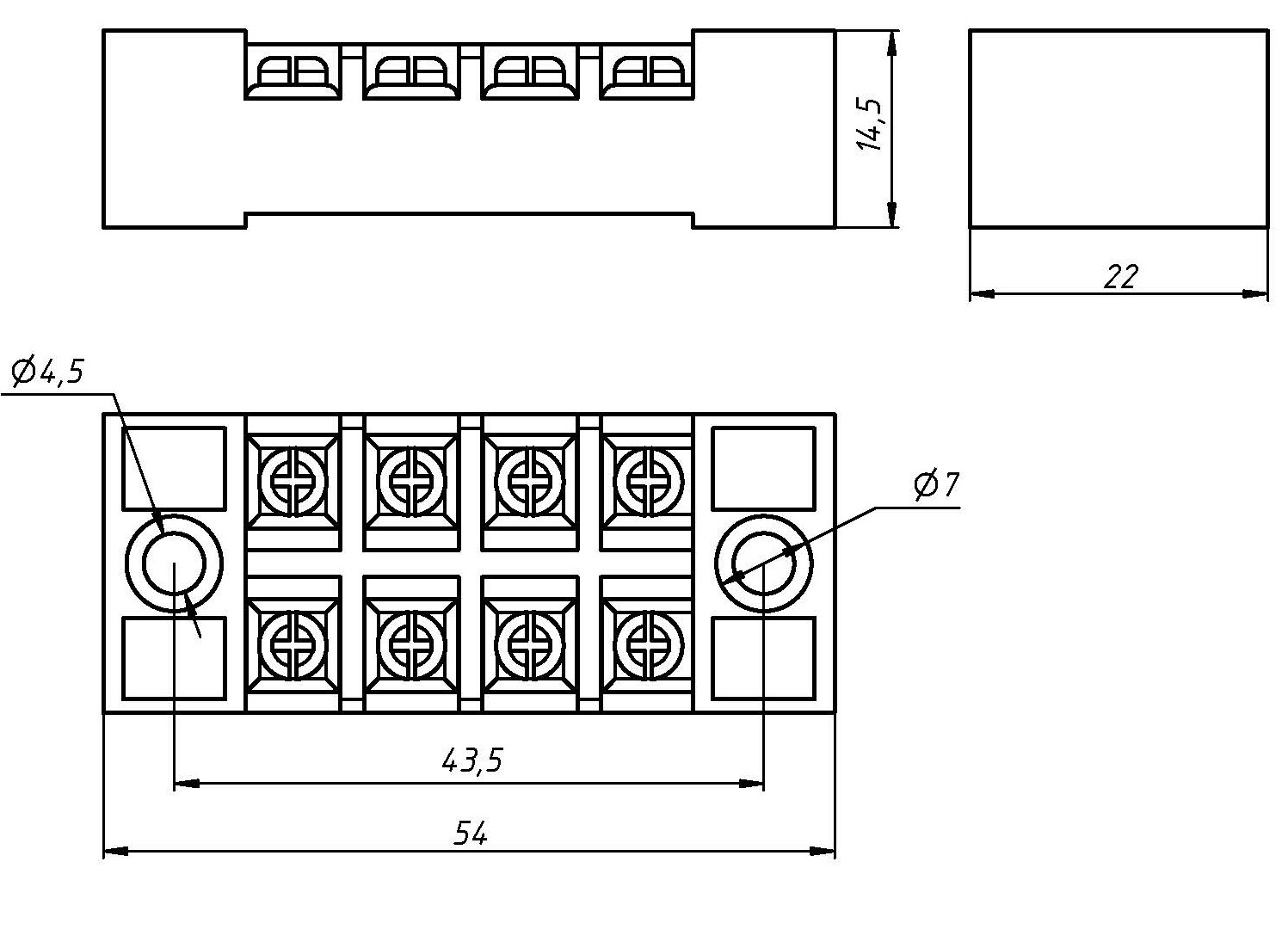 Клеммная колодка TB-1504 предназначена для присоединения и ответвления одножильных и много жильных проводников с максимальным сечением 1,5мм².