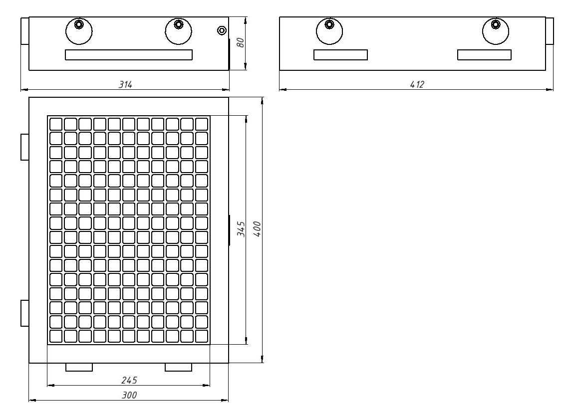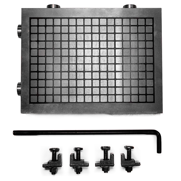 Магнитный стол с постоянным магнитом и механическим рычагом предназначен для использования на электроэрозионных, шлифовальных и фрезерных станках. Его размеры составляют 300 x 400 x 82 мм, а размер ячеек магнита — 18 x 18 мм. Он имеет 165 магнитных полюсов и силу прижима 18 кгс/см². Этот стол подходит для фиксации заготовок толщиной от 2 мм и оснащён ручкой-шестигранником и упорами.