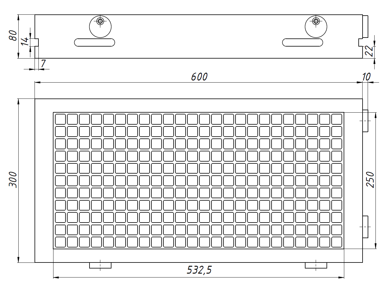 Магнитный стол с постоянным магнитом и механическим рычагом предназначен для использования на электроэрозионных, шлифовальных и фрезерных станках. Его размеры составляют 300 x 600 x 80 мм, а размер ячеек магнита — 18 x 18 мм. Он имеет 264 магнитных полюсов и силу прижима 18 кгс/см². Этот стол подходит для фиксации заготовок толщиной от 2 мм и оснащён ручкой-шестигранником и упорами.