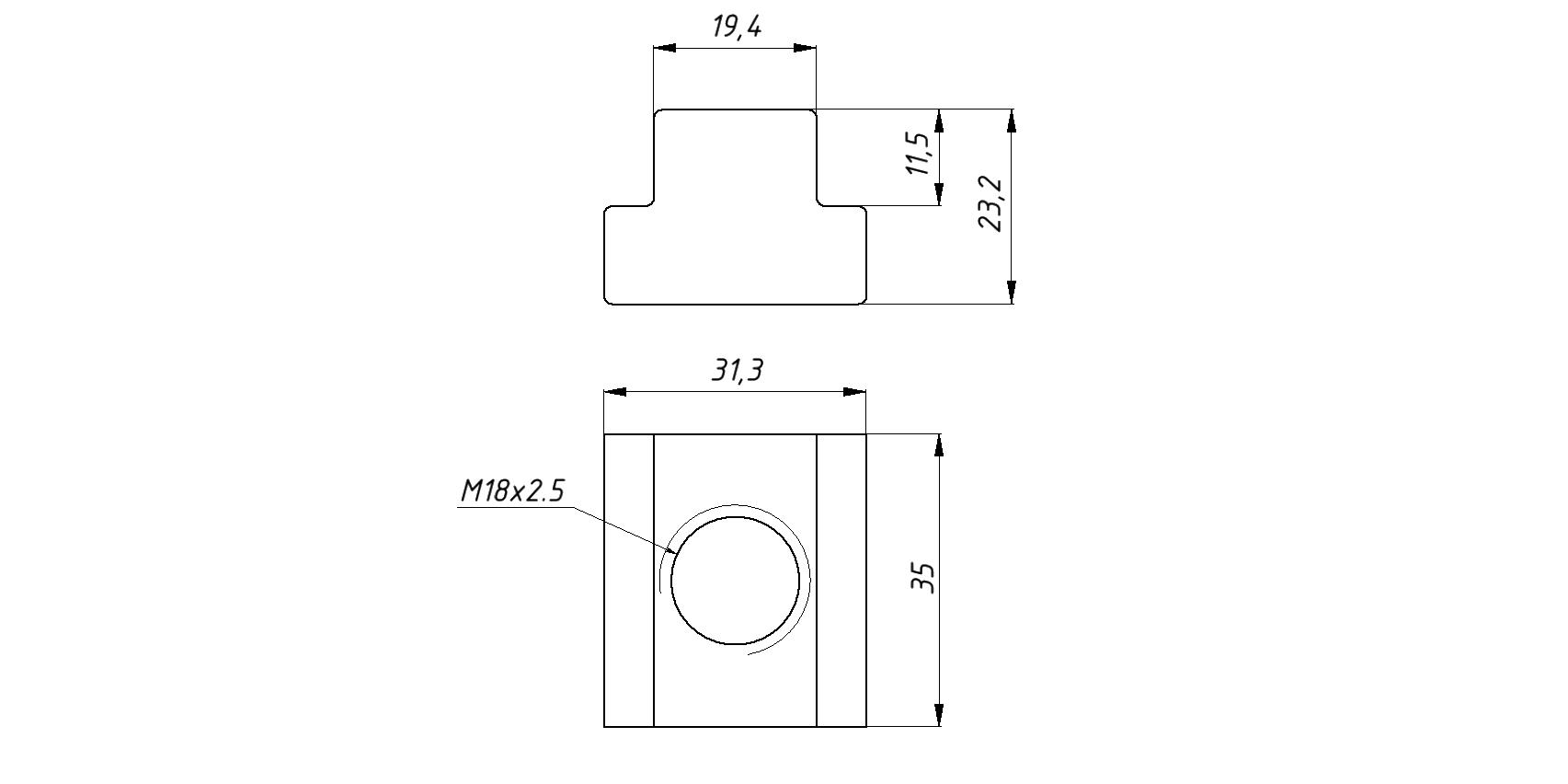 Сухарь для Т-образных станочных пазов. Шпилька М18. Шаг резьбы 2.5 мм.