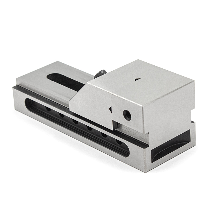 Станочные высокоточные тиски QKG50 изготовлены из легированной стали высокого качества. Используются для крепления и дальнейшей обработки заготовок во фрезерных, шлифовальных и прецизионных расточных станках. Твердость рабочих поверхностей достигает 58-62 HRC, отклонение от параллельности и перпендикулярности не более 5 мкм на 100 мм. Сжимание губок винтом с помощью шестигранника позволяет обойтись без ручки, снизить габариты - такие тиски проще поместить под портал, полностью используя его ход. Подвижная губка имеет горизонтальную и вертикальную проточку для фиксации цилиндрических заготовок.