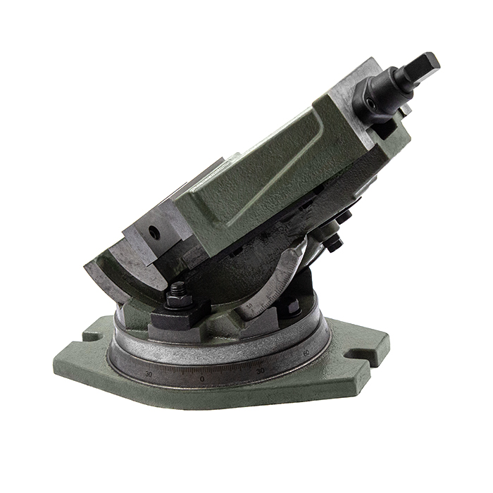 Тиски станочные глобусные двухосевые Q41100. Используются на фрезерных, расточных, сверлильных и других станках, в том числе - с ЧПУ. На тисках реализована установка положения в двух осях. Поворотное основание 360 градусов. Угол подъема вперед до 90 градусов. Тиски снабжены шкалами с ценой деления в 1 градус. Ходовой винт тисков - в закрытом исполнении, что предотвращает попадание стружки и увеличивает ресурс. Корпус тисков выполнен из чугуна, а сменные губки - из стали.