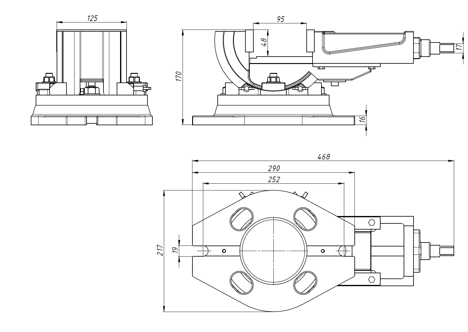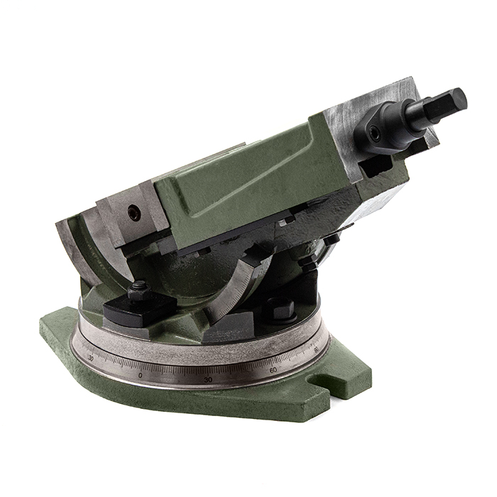 Тиски станочные глобусные двухосевые Q41125. Используются на фрезерных, расточных, сверлильных и других станках, в том числе - с ЧПУ. На тисках реализована установка положения в двух осях. Поворотное основание 360 градусов. Угол подъема вперед до 90 градусов. Тиски снабжены шкалами с ценой деления в 1 градус. Ходовой винт тисков - в закрытом исполнении, что предотвращает попадание стружки и увеличивает ресурс. Корпус тисков выполнен из чугуна, а сменные губки - из стали.