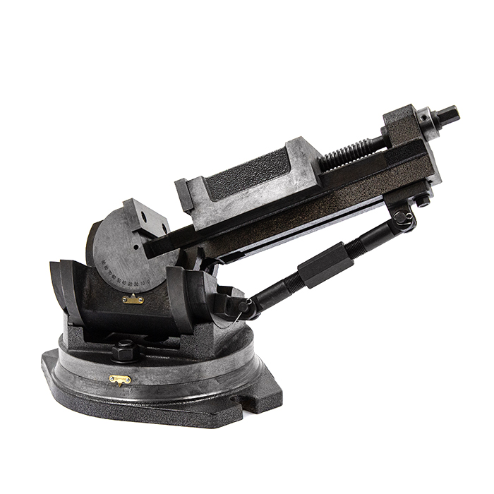 Тиски станочные глобусные трехосевые QW100. Используются на фрезерных, расточных, сверлильных и других станках, в том числе - с ЧПУ. На тисках реализована установка положения в трех осях. Поворотное основание 360 градусов. Угол подъема вперед до 90 градусов. Угол наклона влево и вправо до 45 градусов. Тиски снабжены шкалами с ценой деления в 1 градус. Корпус тисков выполнен из чугуна, а сменные губки - из стали.