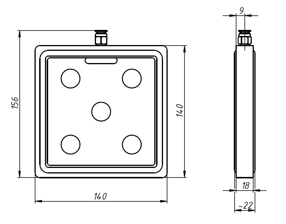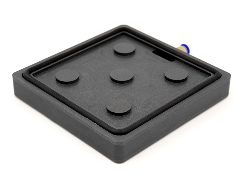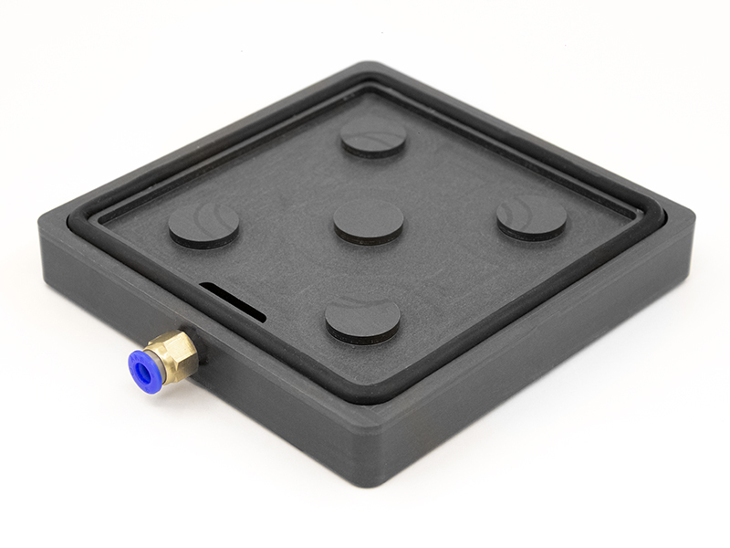 ВП 140х140 мм (двухсторонняя) – габаритные размеры 140х140х22 мм (толщина без шнура 18 мм), выполнена из листового алюминия, установлен фитинг PC6-М6 для подключения шланга вакуумного насоса с наружным диаметром 6 мм, предпочтительно использовать с бесщеточными вакуумными насосами например- FY-1H-N 150Вт, установка производится совместно с обрабатываемым материалом при помощи вакуума.