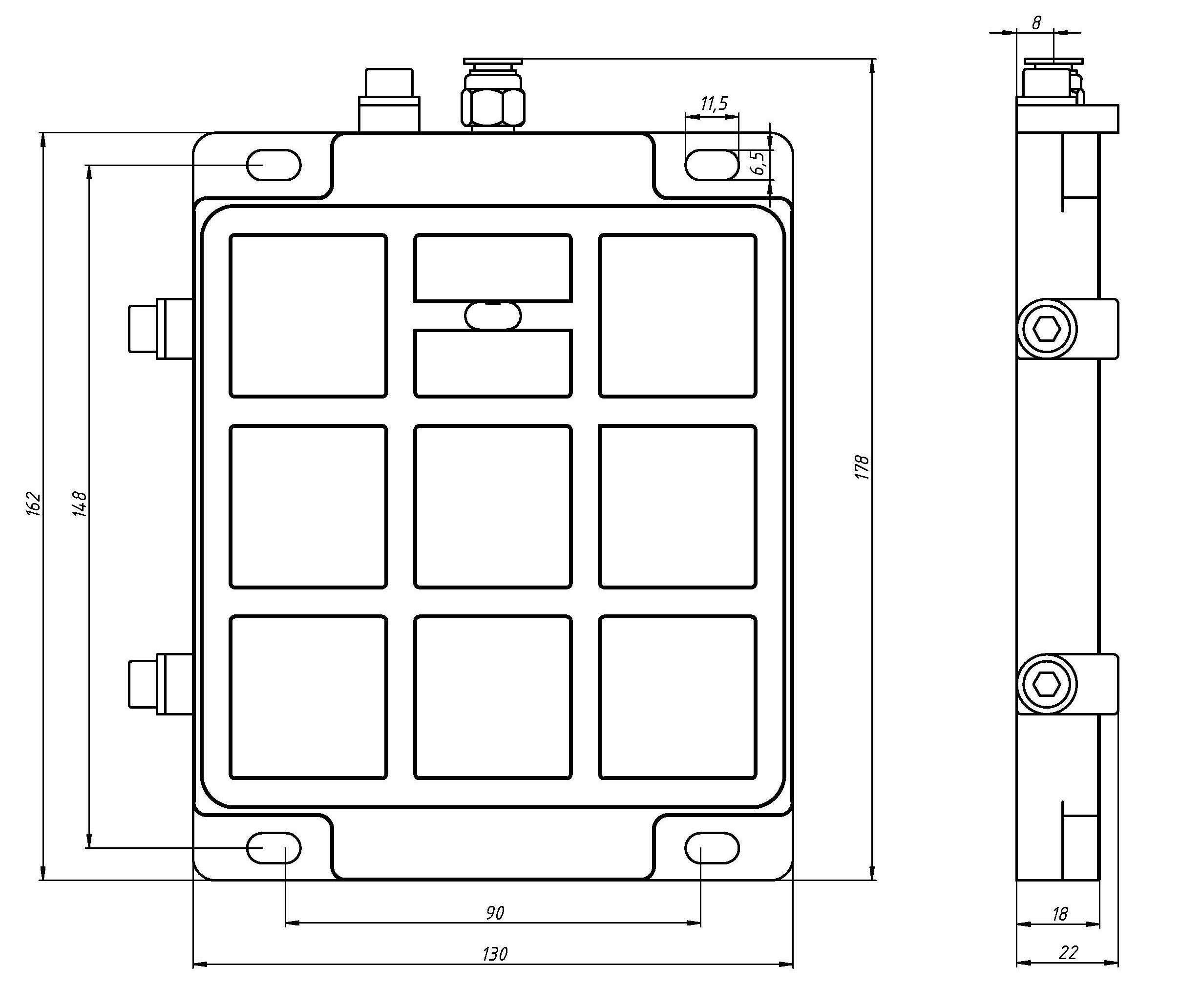 ВП 130х160 мм (односторонняя) – габаритные размеры 130х162х22 мм (толщина без шнура 18 мм), выполнена из листового алюминия, установлен фитинг PC6-М6 для подключения шланга вакуумного насоса с наружным диаметром 6 мм, предпочтительно использовать с бесщеточными вакуумными насосами например- FY-1H-N 150Вт, установка производится механически винтами М6. Для удобства использования и выставления заготовок на присоске установлены ограничители (3 шт), которые могут быть скрыты простым поворотом вокруг крепёжного болта.