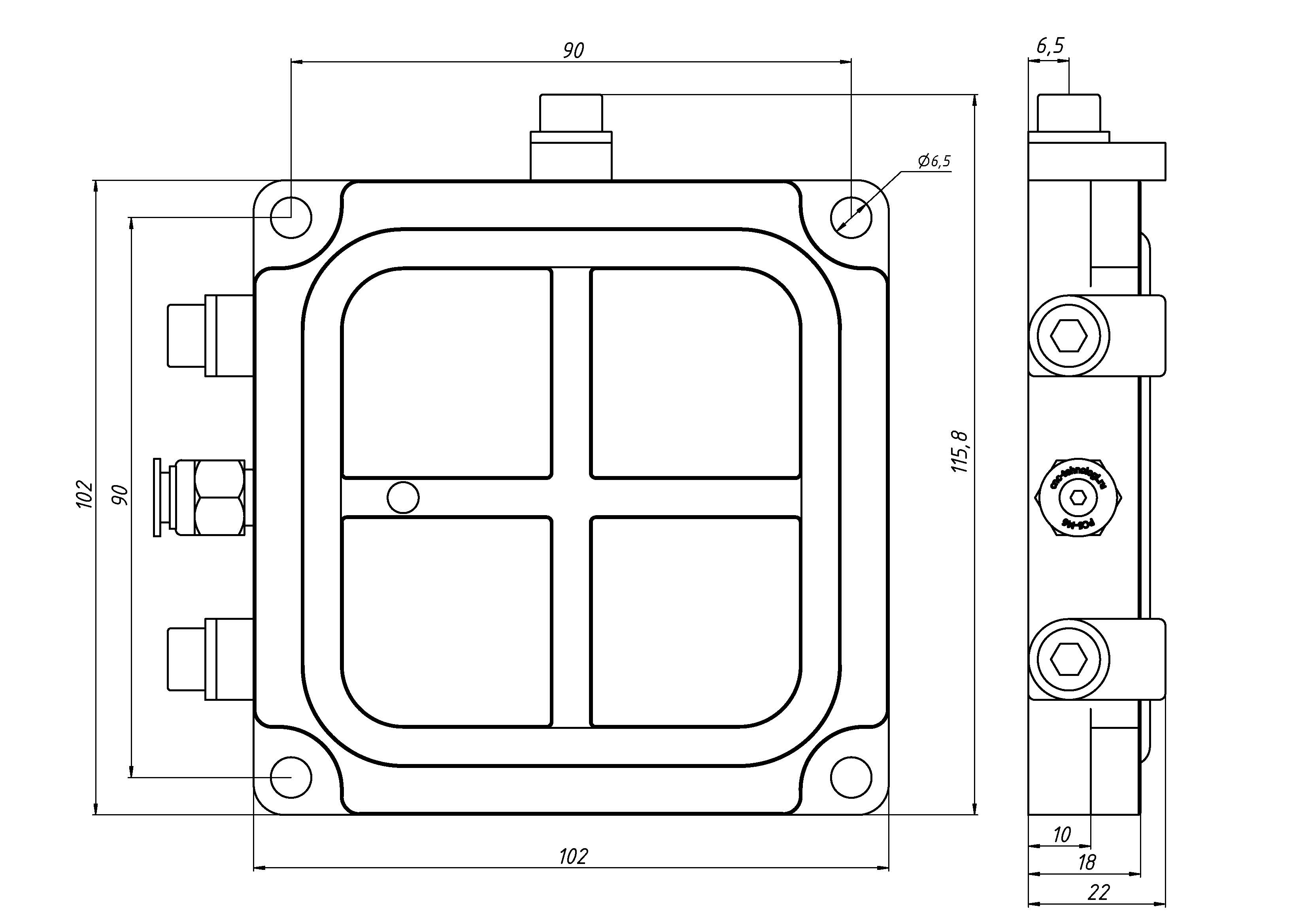 ВП 100х100 мм (односторонняя) – габаритные размеры 102х102х22 мм (толщина без шнура 18 мм), выполнена из листового алюминия, установлен фитинг PC6-М6 для подключения шланга вакуумного насоса с наружным диаметром 6 мм, предпочтительно использовать с бесщеточными вакуумными насосами например- FY-1H-N 150Вт, установка производится механически винтами М6. Для удобства использования и выставления заготовок на присоске установлены ограничители (3 шт), которые могут быть скрыты простым поворотом вокруг крепёжного болта.