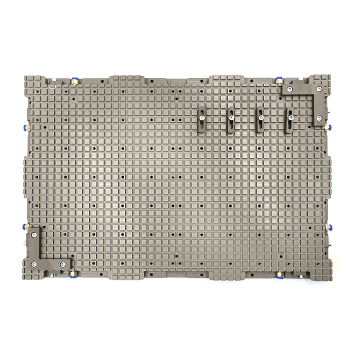 Для удобства использования и выставления заготовок в комплект входит набор ограничителей и уголков. Ограничители находятся у каждого угла стола (по два на угол) и могут быть скрыты простым поворотом вокруг крепёжного болта. Уголки устанавливаются на поверхности сетчатого стола и крепятся к болтами в подготовленные для этого отверстия с резьбой. В комплекте так же имеется четыре прижима на случай, если надо закрепить заготовку без использования вакуума (например, для подготовки базовой поверхности без демонтажа стола).