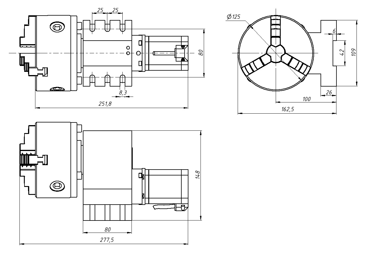 Для зажима заготовки в поворотной оси используется самоцентрирующийся токарный патрон. В качестве привода используется шаговый электродвигатель. Передача вращающего момента на токарный патрон с двигателя осуществляется через цилиндрический редуктор.