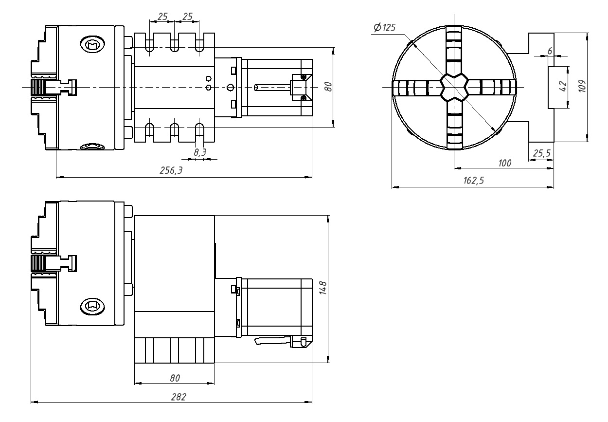 Для зажима заготовки в поворотной оси используется самоцентрирующийся токарный патрон. В качестве привода используется шаговый электродвигатель. Передача вращающего момента на токарный патрон с двигателя осуществляется через цилиндрический редуктор.