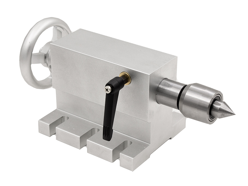 Задняя бабка для поворотных осей высотой 65 мм. Прижимающий конец бабки выполнен в виде тонкого ободка диаметром 16 мм, и центрирующей иглы, что позволяет фиксировать заготовки без сопутствующего расщепления (если материал заготовки склонен щепиться и трескаться).