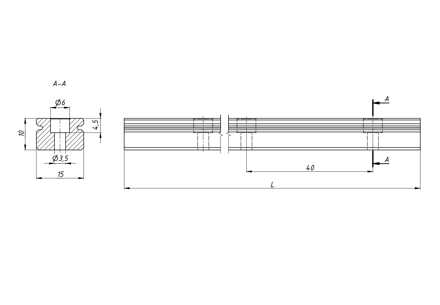 Рельс длиной 2000 мм имеет 50 крепежных отверстий, расположенных на расстоянии 40 мм друг от друга. От одного из торцов направляющей крайнее отверстие удалено на 15 мм.