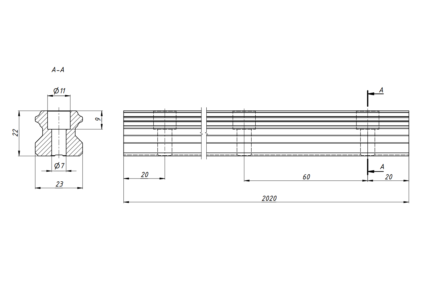 Рельс длиной 2020 мм имеет 34 крепежных отверстия, расположенных на расстоянии 60 мм друг от друга. Крайние отверстия удалены от торцов направляющей на 20 мм.