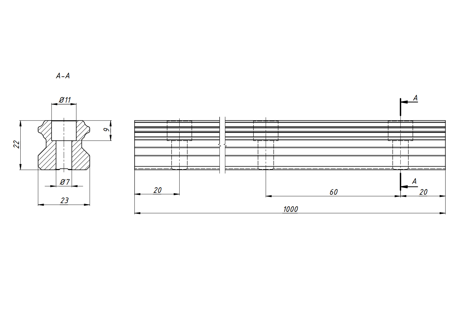 Рельс длиной 1000 мм имеет 17 крепежных отверстий, расположенных на расстоянии 60 мм друг от друга. Крайние отверстия удалены от торцов направляющей на 20 мм.