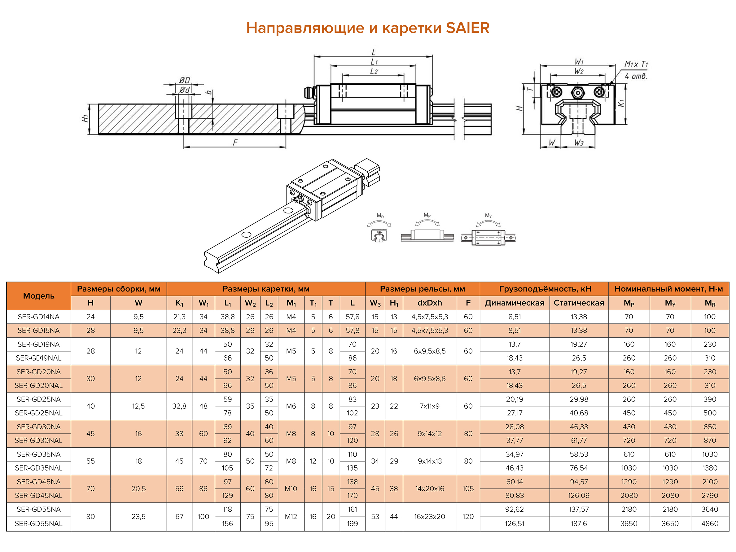 Каретка бесфланцевая SAIER для профильных рельс GD20. Обладает повышенной грузоподъёмностью, жесткостью и точностью. За счёт плавного хода обеспечивается низкий уровень шума.