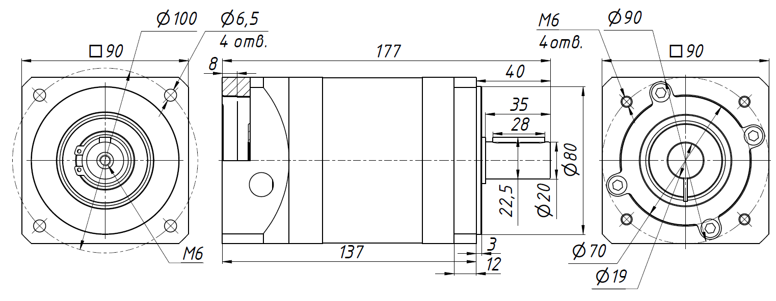 Планетарный редуктор с квадратным монтажным фланцем серии PLF. Данная серия обладает высокими КПД и точностью, а также малым люфтом.