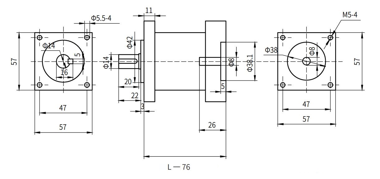 Одноступенчатый планетарный редуктор с крепежным фланцем для шаговых двигателей типоразмера 57 мм (NEMA23). Фиксация вала происходит за счет стягивания вала двигателя диаметром 8 мм. Планетарные редукторы в сравнении с червячными и цилиндрическими обладают такими преимуществами, как соосность входного и выходного вала, а также высоким КПД.