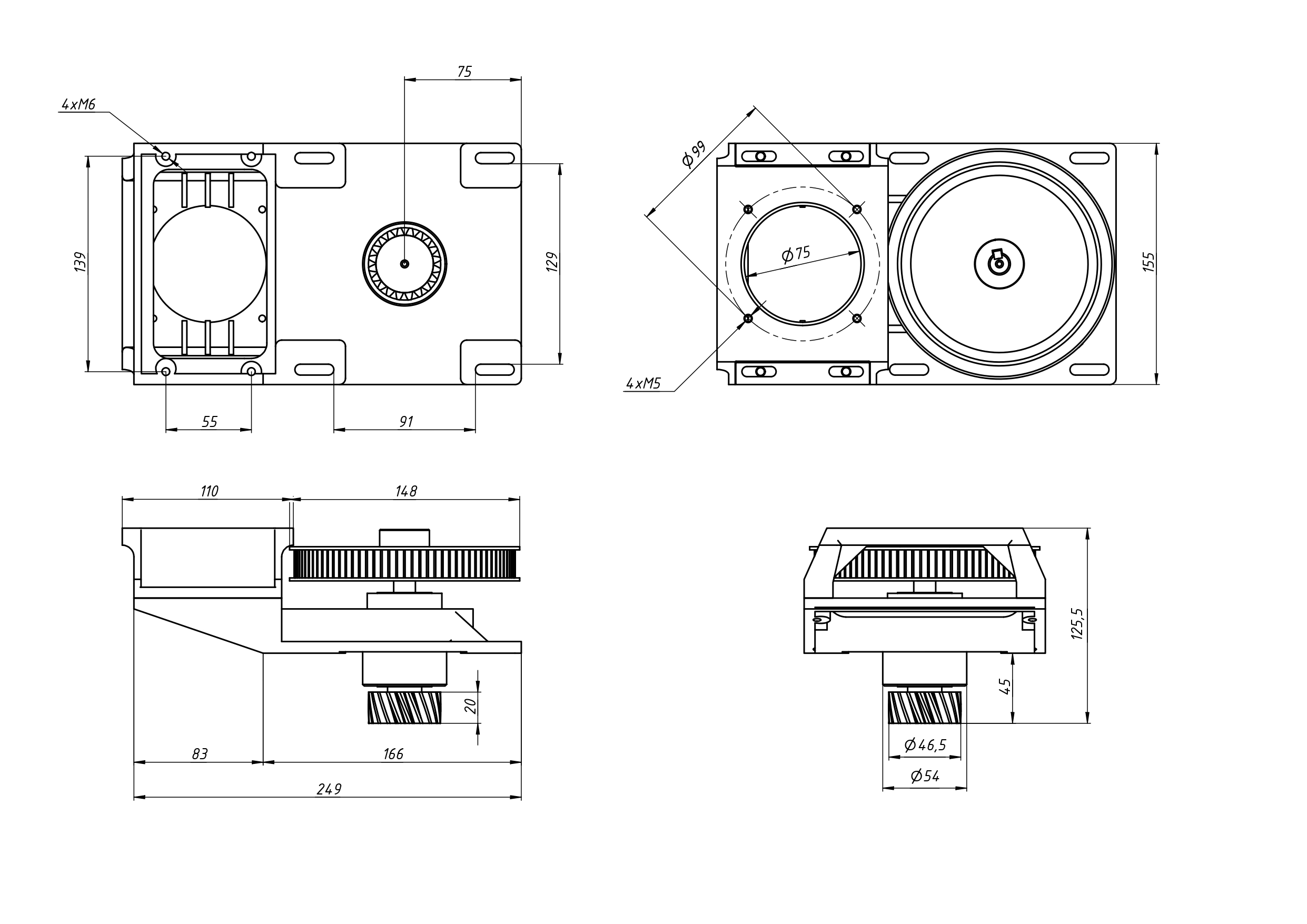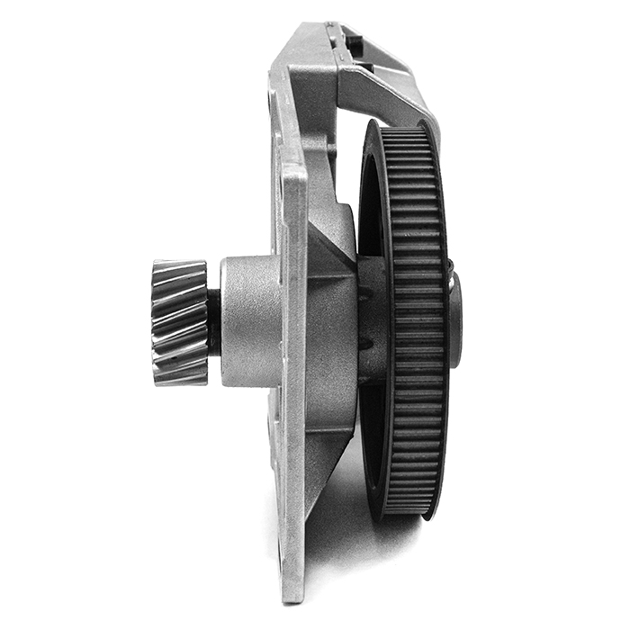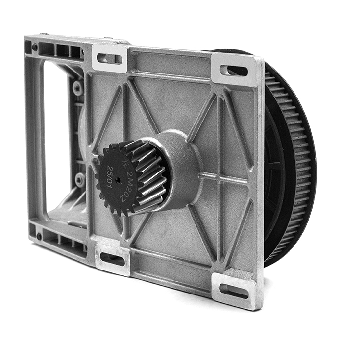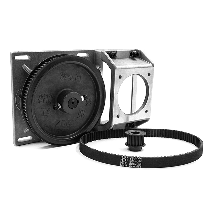 В качестве связи между ведомым и ведущим шкивом ременного редуктора применяется зубчатый ремень HTD550-5M. Сам редуктор состоит из литого алюминиевого корпуса, кронштейна для крепления шагового двигателя и вала, на концах которого находится ведомый шкив с одной стороны и шестерня косозубой зубчатой рейки с другой.