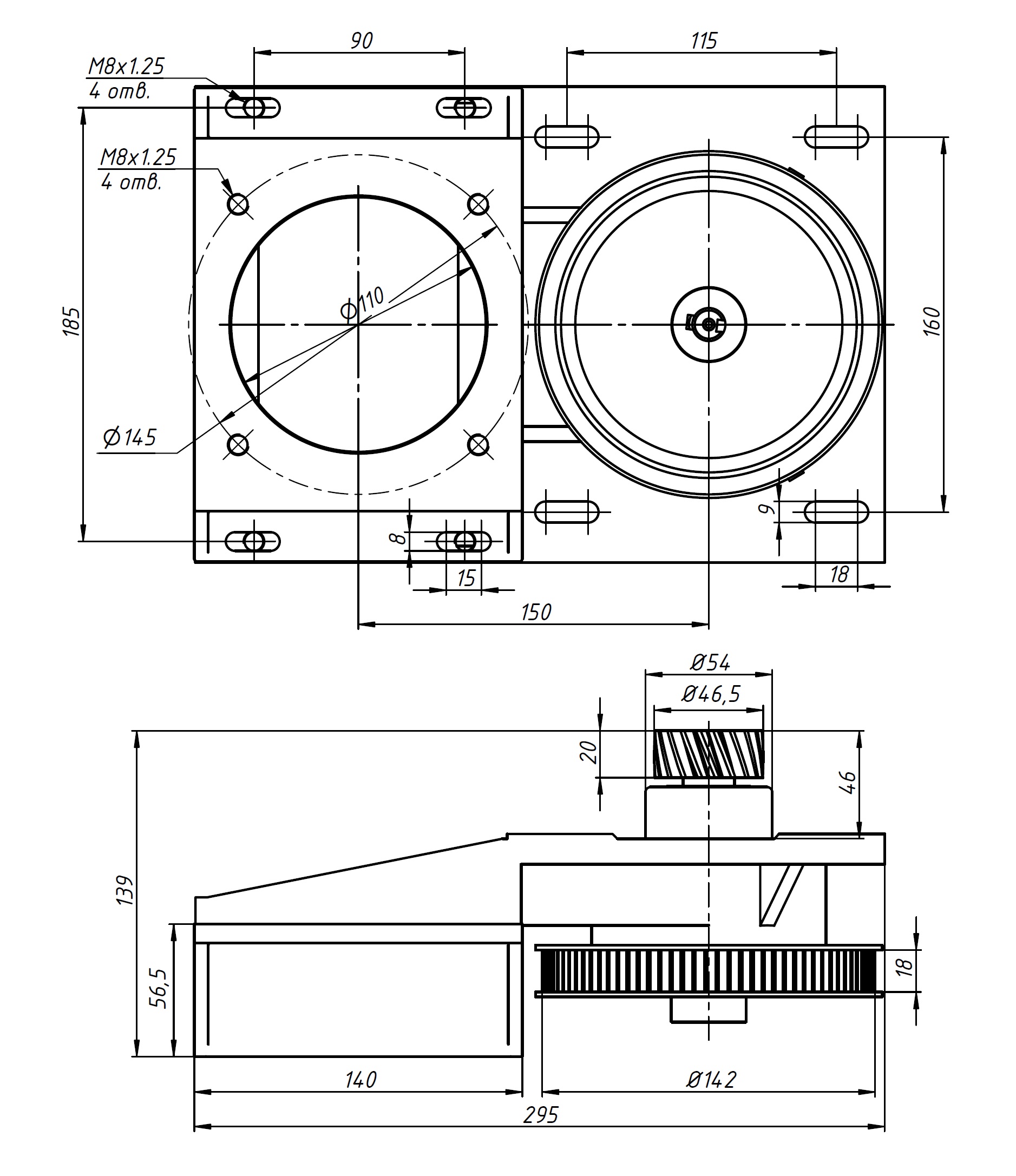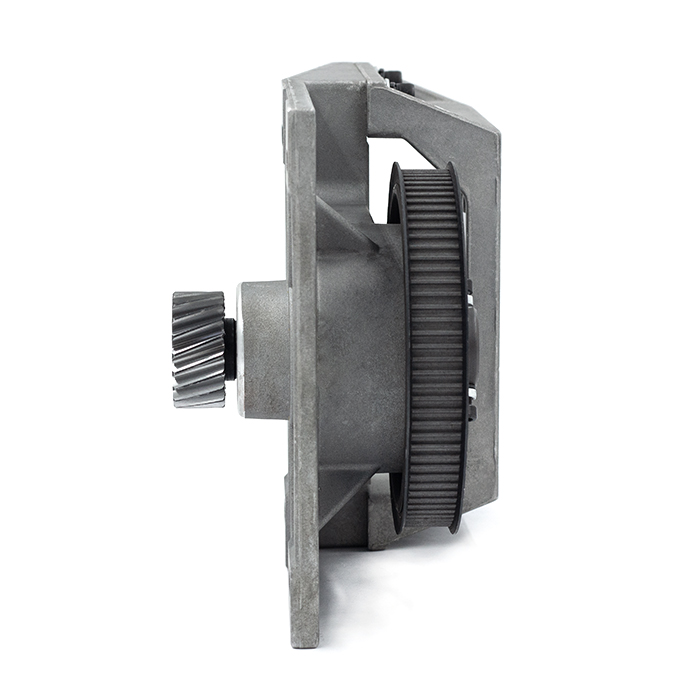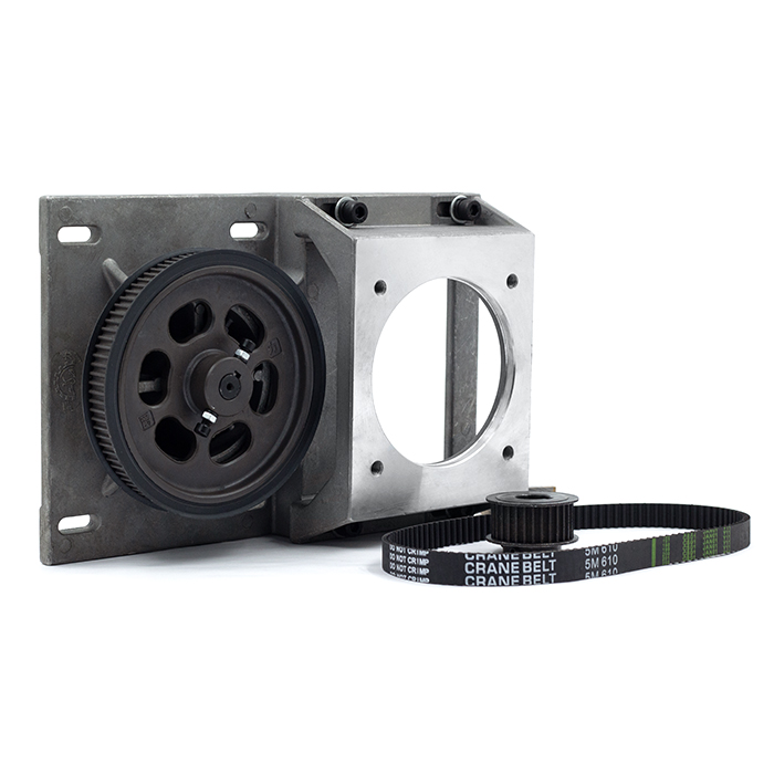 В качестве связи между ведомым и ведущим шкивом ременного редуктора применяется зубчатый ремень HTD610-5M. Сам редуктор состоит из литого алюминиевого корпуса, кронштейна для крепления двигателя и вала на концах которого находится ведомый шкив с одной стороны и шестерня зубчатой рейки с другой.