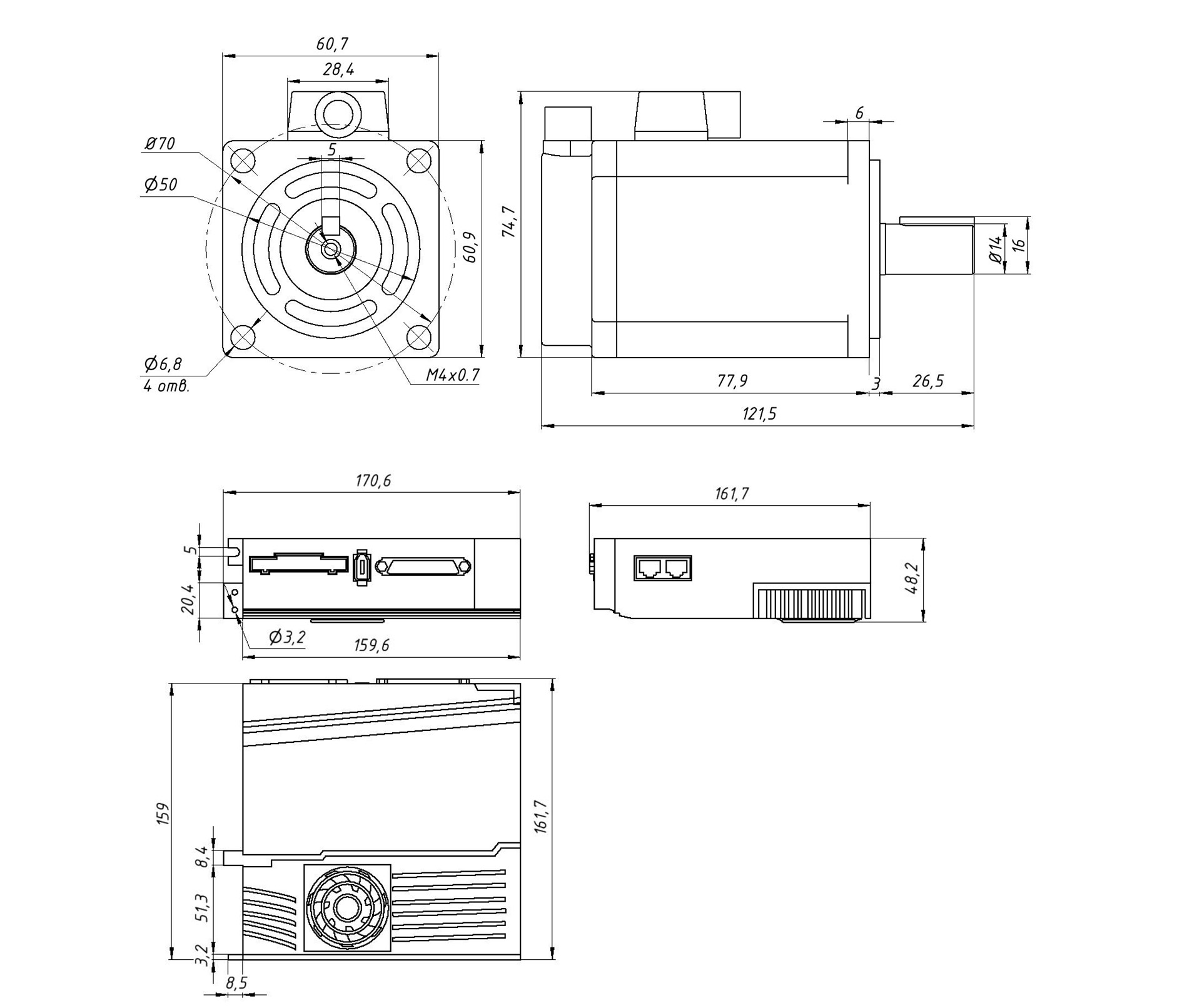 Комплект состоит из сервопривода, серводвигателя и комплекта электропроводки для подключения.