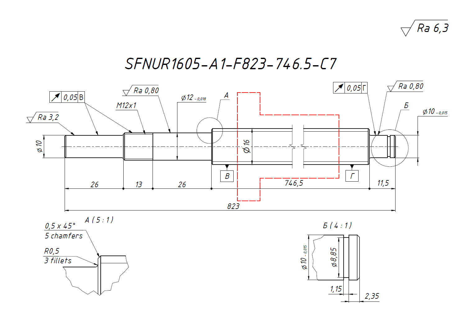 Готовый комплект ШВП (винт + гайка) SFNUR1605-A1-F823-746.5-C7 с обработанными концами под подшипники и муфту. Он не требует дополнительной подгонки: Гайка ШВП SFU 1605 надета на винт, нанесена смазка. Класс точности C7.