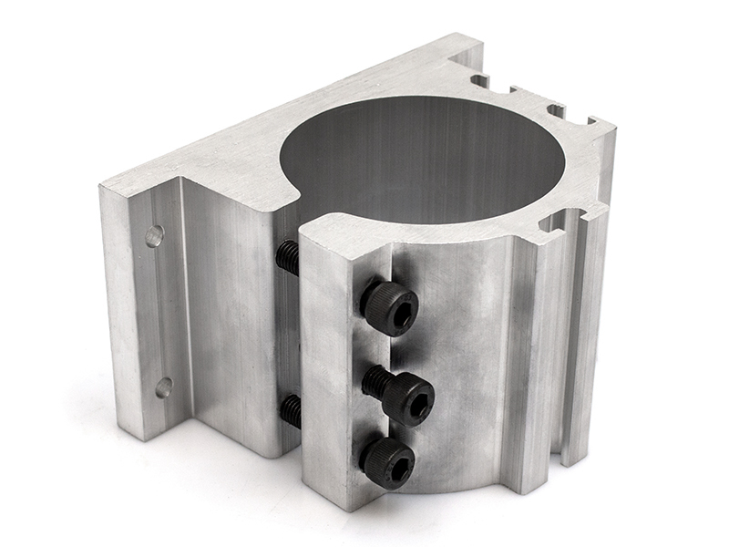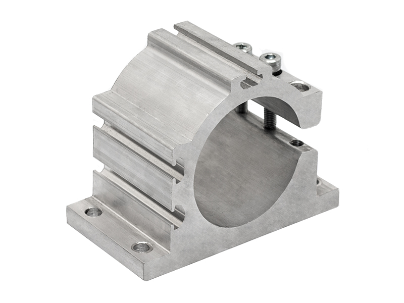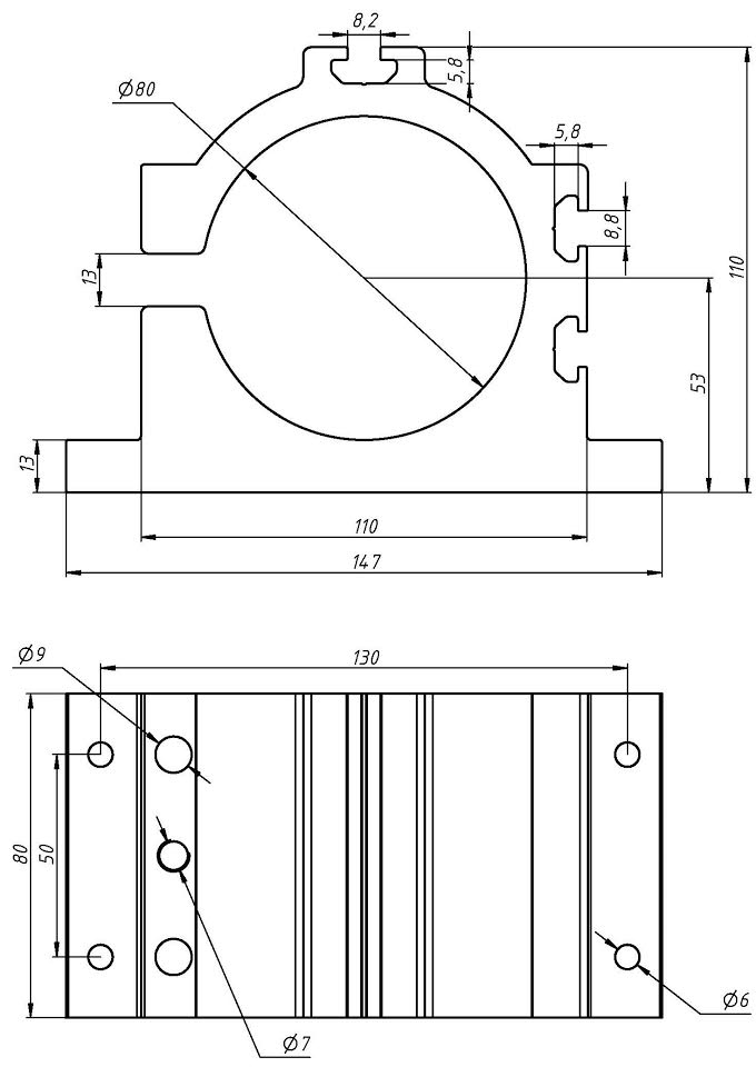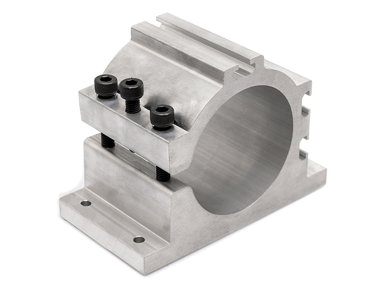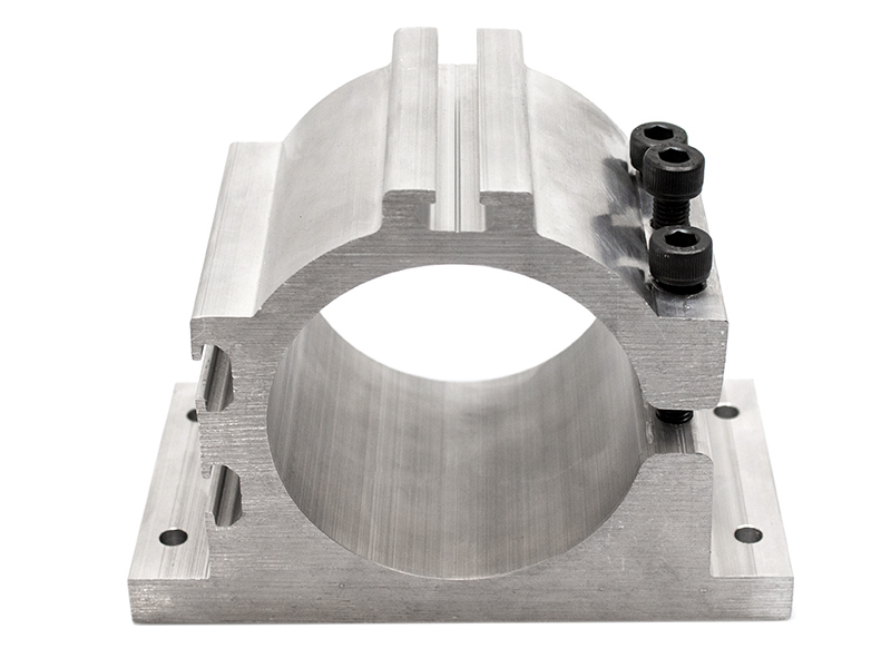 Алюминиевый кронштейн для фиксации шпинделя с цилиндрическим корпусом диаметром 80 мм на вертикальной оси гравировально-фрезерного станка. Конструкция профиля имеет Т-пазы для монтажа дополнительного оборудования прямо на креплении. Дополнительно на кронштейне предусмотрены отверстия для крепления щетки-насадки пылеудаления.