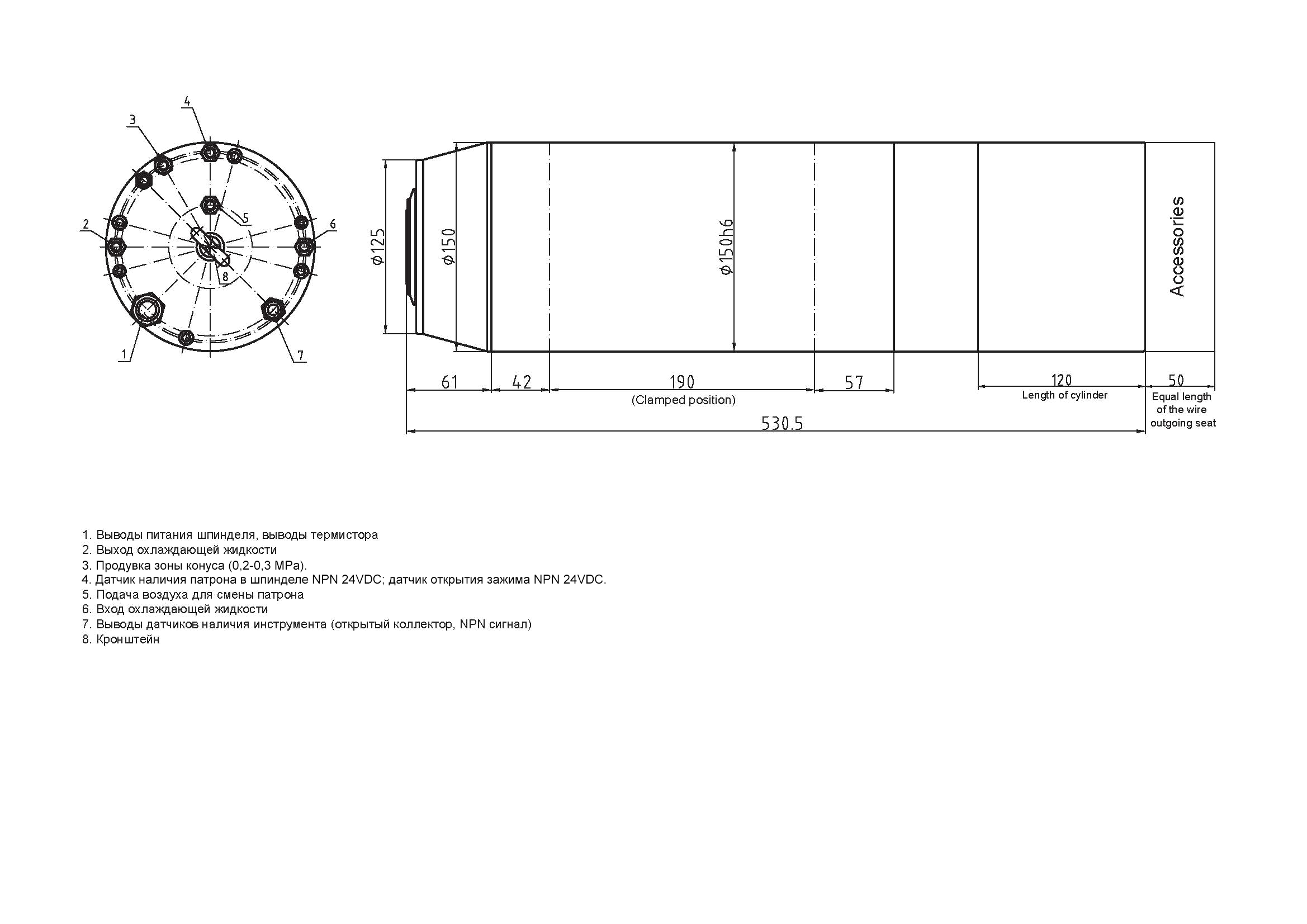 Внимание! Для нормальной работы шпинделя необходима подача сжатого воздуха для создания воздушного уплотнения, препятствующего попаданию пыли и СОЖ внутрь шпинделя. Отверстие для подачи воздуха находится в нижней части шпинделя. Воздух должен быть сухим и очищенным, точность фильтрации должна составлять 0,1 мкм. Избыточное давление воздушного уплотнения нижнего подшипника должно составлять 0,2-0,25 МПа.
