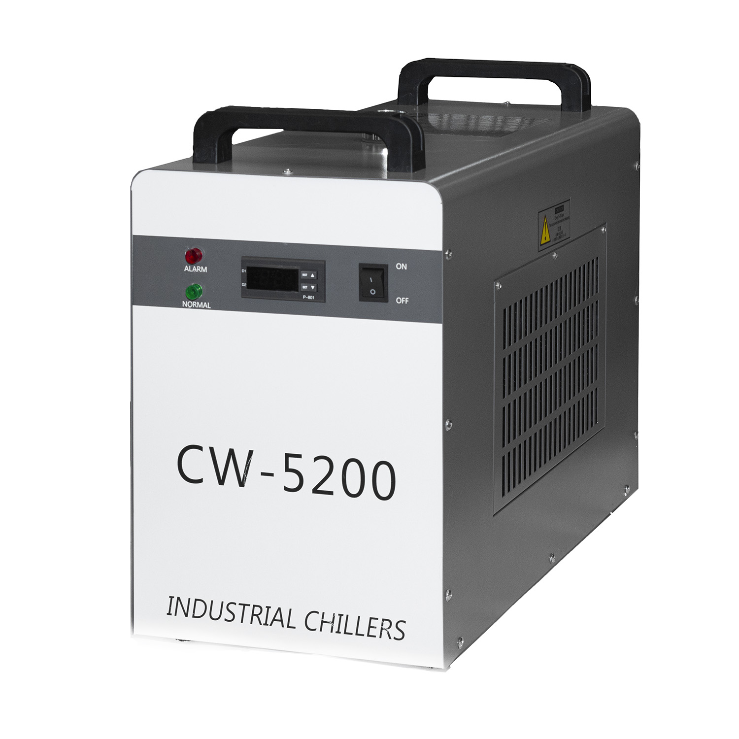 CW-5200AG – это промышленная система охлаждения с хладагентом (чиллер). Данная модель в основном используется для отвода тепла от лазерных трубок мощностью до 120 Вт в процессе лазерного излучения и поддержания температурного режима электрических шпинделей жидкостного охлаждения мощностью 5,5 кВт и выше, а также охлаждения иного оборудования. Температура охлаждающей жидкости может быть отрегулирована в необходимом диапазоне. Имеет два режима контроля температуры охлаждающей жидкости. Первый – это контроль температуры в заданном диапазоне, второй - регулировка температуры в зависимости от окружающей среды.