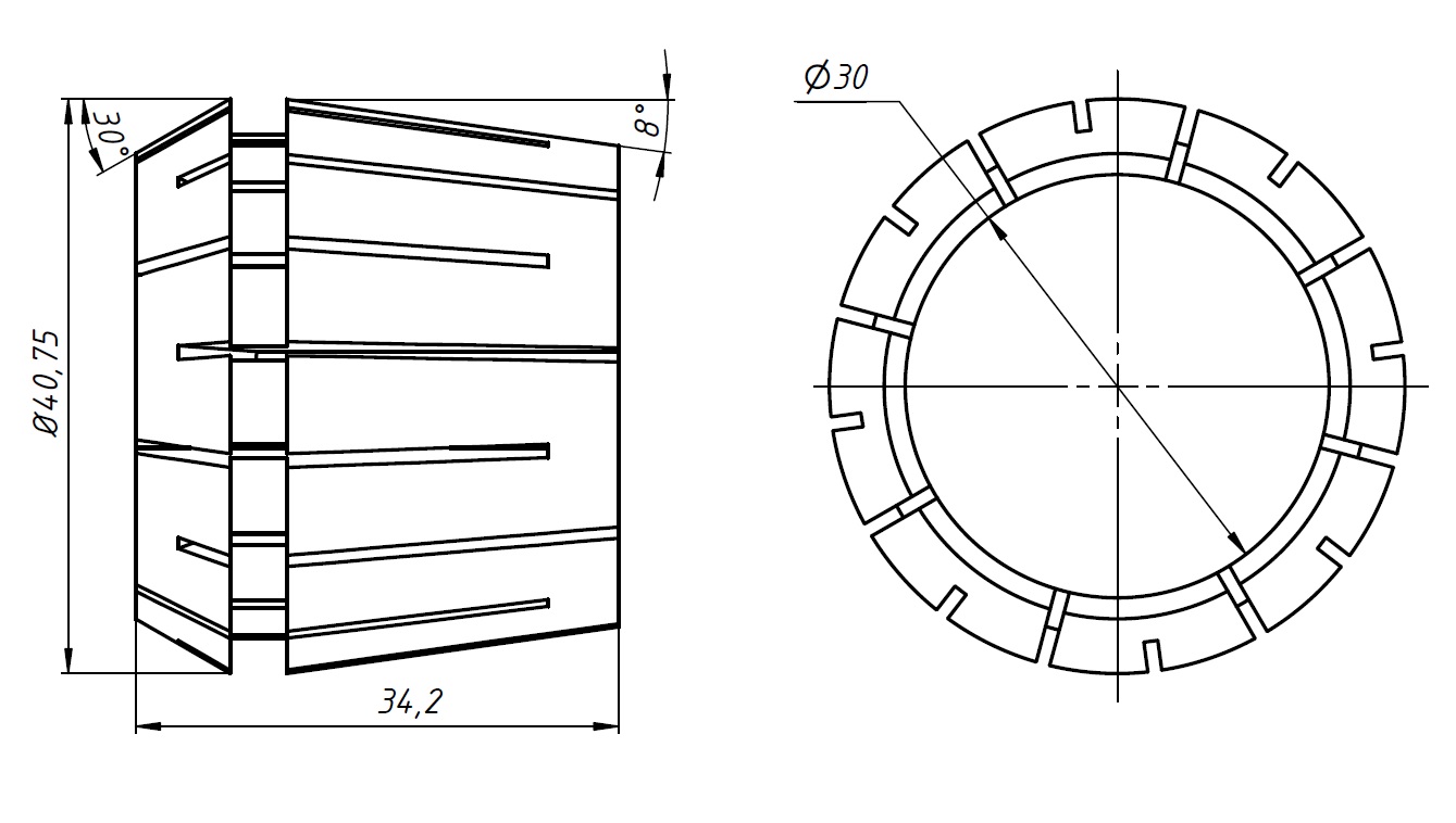 Предназначена для зажима инструмента или детали цилиндрической формы, например, фрез с цилиндрическим хвостовиком. Устанавливается в специально предназначенный для нее цанговый патрон.