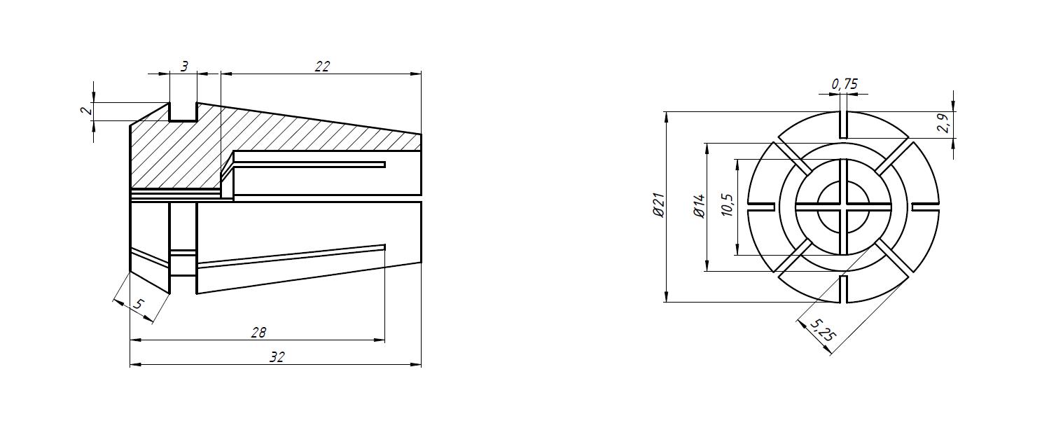 Предназначена для зажима инструмента или детали цилиндрической формы, например, фрез с цилиндрическим хвостовиком. Устанавливается в специально предназначенный для нее цанговый патрон.
