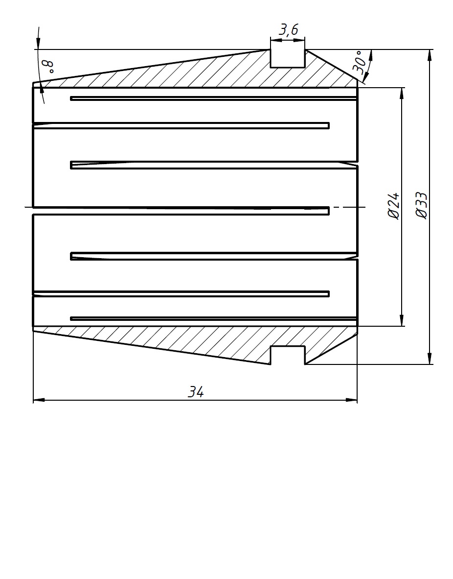 Предназначена для зажима инструмента или детали цилиндрической формы, например, фрез с цилиндрическим хвостовиком. Устанавливается в специально предназначенный для нее цанговый патрон.