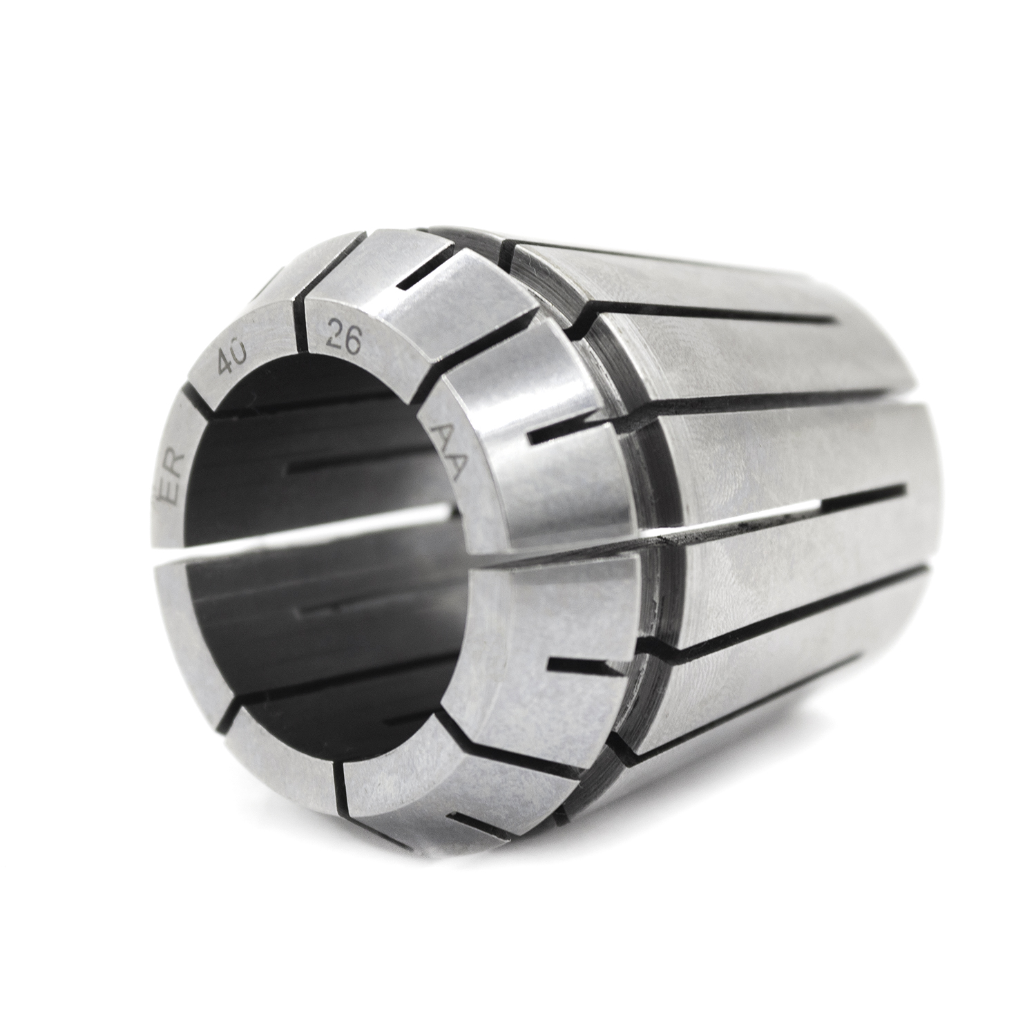 Зажимная цанга для цангового патрона типа ER40 со сквозным отверстием и двумя зонами зажима.