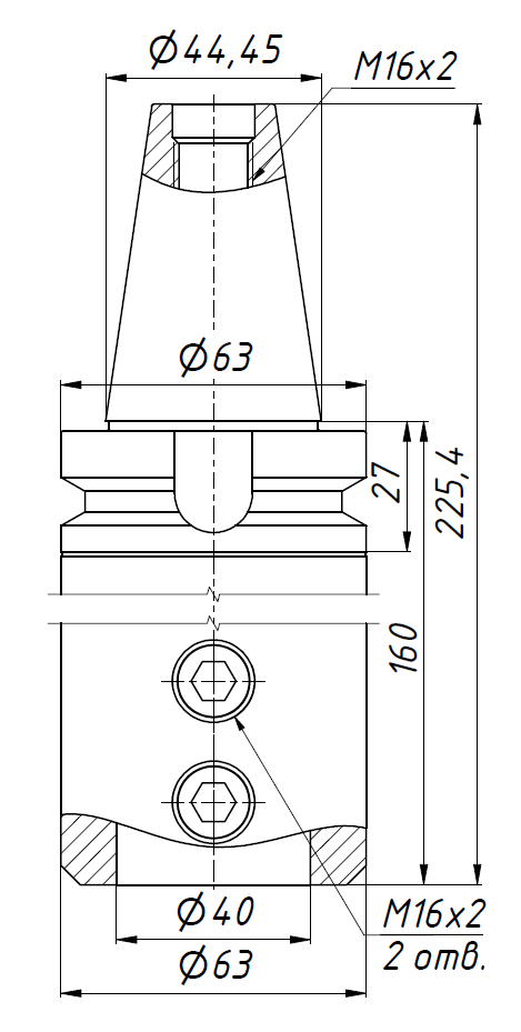 Патрон BT40-SL40-160 предназначен для фиксации режущего инструмента с цилиндрическим хвостовиком Weldon диаметром 40 мм, используется в сверлильных, фрезерных станках с ЧПУ и обрабатывающих центрах. Для зажима инструмента используется два винта. Фиксация хвостовика BT40 в шпинделе производится при помощи штревельного болта M16, который не входит в комплект и приобретается дополнительно.