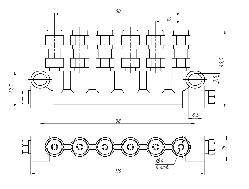Разветвитель для подачи масла или жидкой смазки.Если отводы не используются, то в один из них вставляется предохранительный клапан, а остальные глушатся пробками.