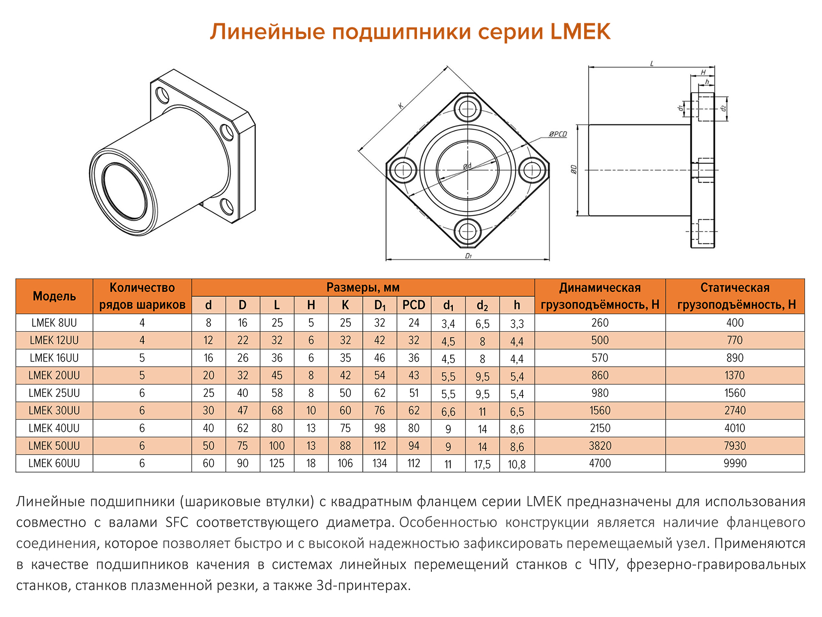 Линейные подшипники (шариковые втулки) с квадратным фланцем серии LMEK предназначены для использования совместно с валами SFC соответствующего диаметра. Особенностью конструкции является наличие фланцевого соединения, которое позволяет быстро и с высокой надежностью зафиксировать перемещаемый узел. Применяются в качестве подшипников качения в системах линейных перемещений станков с ЧПУ, фрезерно-гравировальных станков, станков плазменной резки, а также 3d-принтерах.