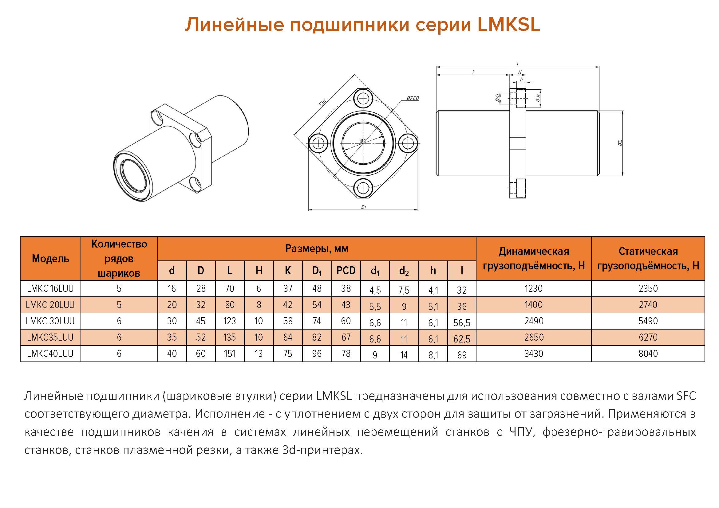 Линейные подшипники (шариковые втулки) серии LMKCL предназначены для использования совместно с валами SFC соответствующего диаметра. Исполнение - с уплотнением с двух сторон для защиты от загрязнений. Применяются в качестве подшипников качения в системах линейных перемещений станков с ЧПУ, фрезерно-гравировальных станков, станков плазменной резки, а также 3d-принтерах.