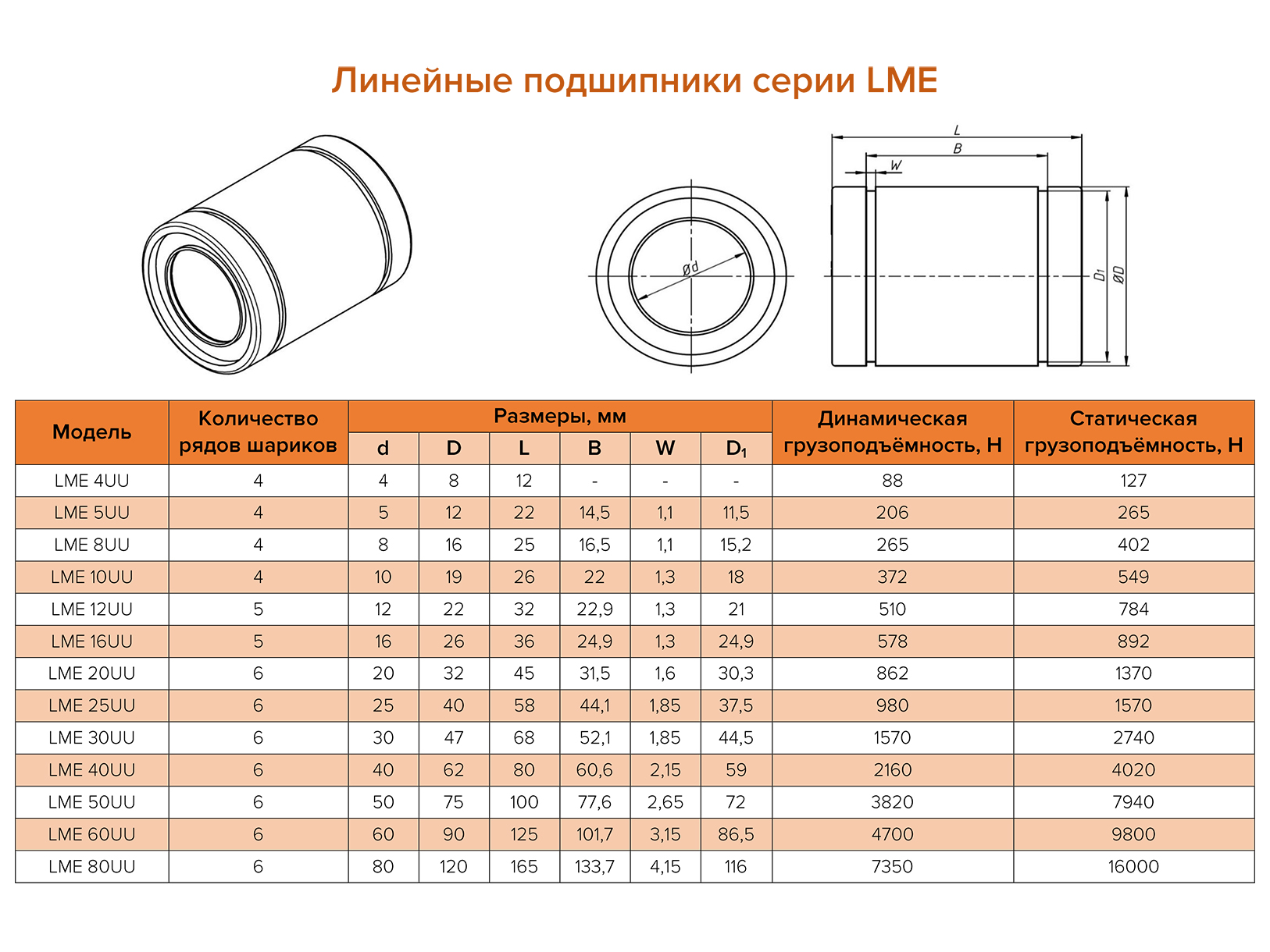 Линейные подшипники серии LME предназначены для использования совместно с валами SFC соответствующего диаметра. Применяются в качестве подшипников качения в системах линейных перемещений станков с ЧПУ, фрезерно-гравировальных станков, станков плазменной резки, а также 3d-принтерах.
