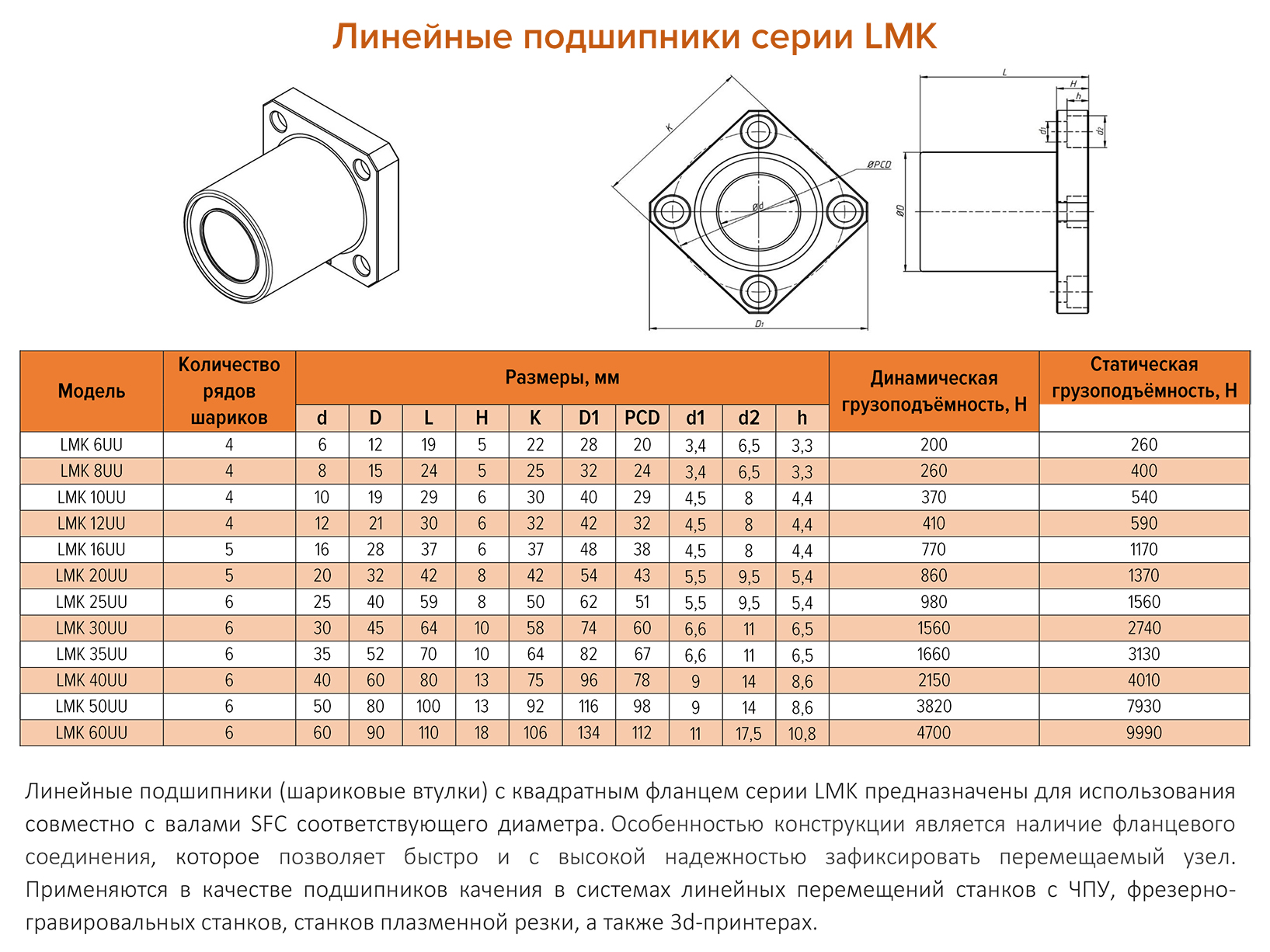 Линейные подшипники (шариковые втулки) с квадратным фланцем серии LMK предназначены для использования совместно с валами SFC соответствующего диаметра. Особенностью конструкции является наличие фланцевого соединения, которое позволяет быстро и с высокой надежностью зафиксировать перемещаемый узел. Применяются в качестве подшипников качения в системах линейных перемещений станков с ЧПУ, фрезерно-гравировальных станков, станков плазменной резки, а также 3d-принтерах.